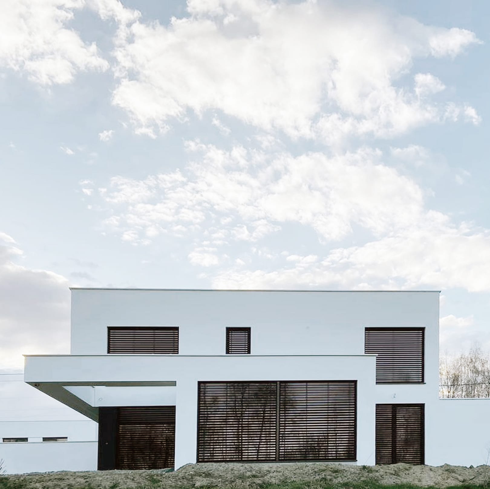 "Biała willa", zaprojektowana z dbałością o proporcje bryły i spójność kompozycji. Minimalistyczna elewacja oparta niemal wyłącznie na tynku w dwóch odcieniach wymagała bardzo precyzyjnego podejścia – zarówno w rozmieszczeniu okien, jak i w detalach nadwieszeń czy ram okiennych. W przypadku tak oszczędnych projektów, nic nie może być przypadkowe. Przestawienie okna czy zmiana grubości ramy może zaburzyć cały efekt. Front budynku został celowo niemal całkowicie zamknięty – z ograniczoną ilością przeszkleń i wolnostojącą ścianą osłaniającą część ogrodu. Wnętrze domu otwiera się natomiast na ogród z boku i od strony tarasu.