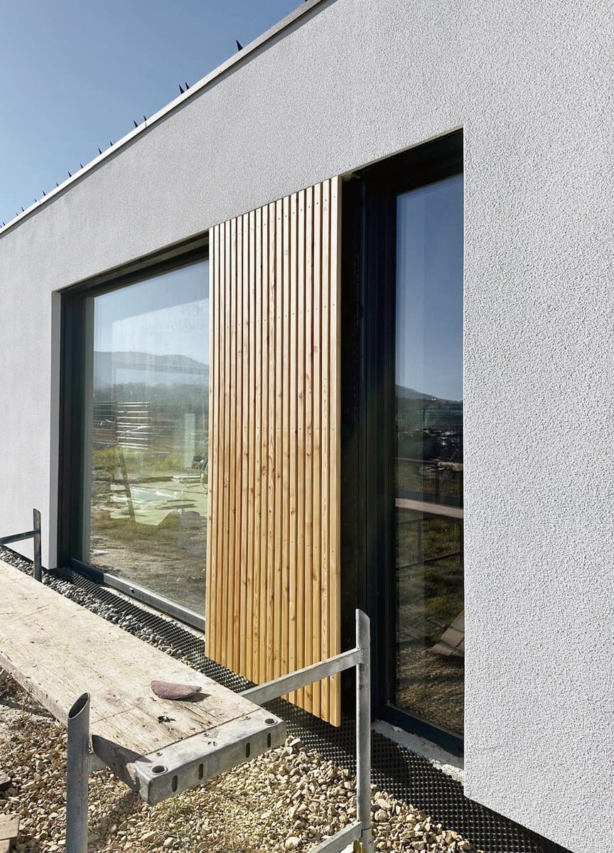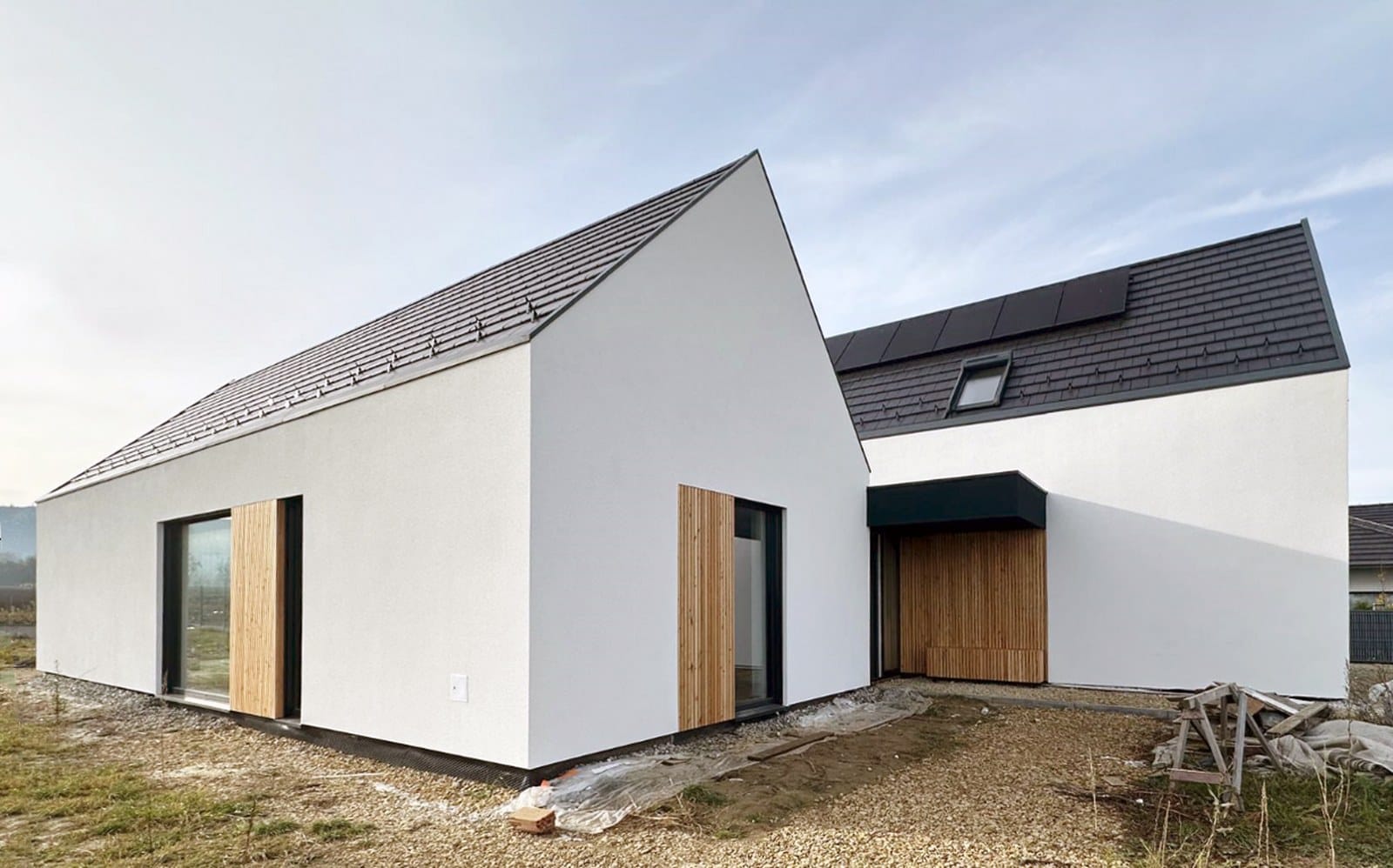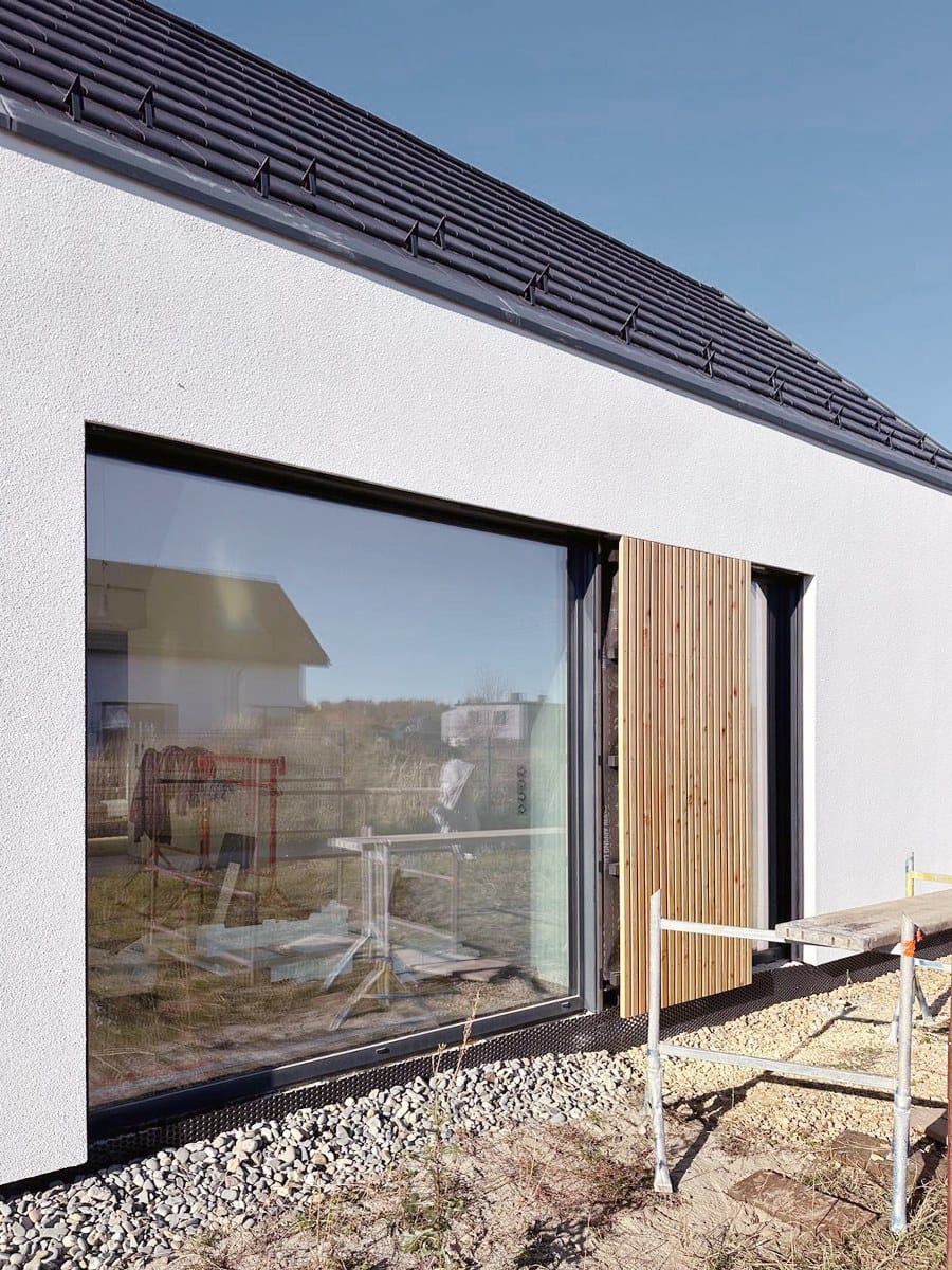 „Stodoły” zostały przesunięte względem siebie, dzięki czemu stworzono dwie osłonięte przestrzenie zewnętrzne: półprywatny placyk wejściowy z zadaszonym miejscem na poranną kawę czy spotkania z sąsiadami oraz duży, częściowo zadaszony prywatny taras dla rodziny, otwarty na część rekreacyjną działki – intymny ogród. Takie ukształtowanie formy budynku pozwoliło uzyskać niewielką skalę domu i ciekawą przestrzeń wokół budynku.