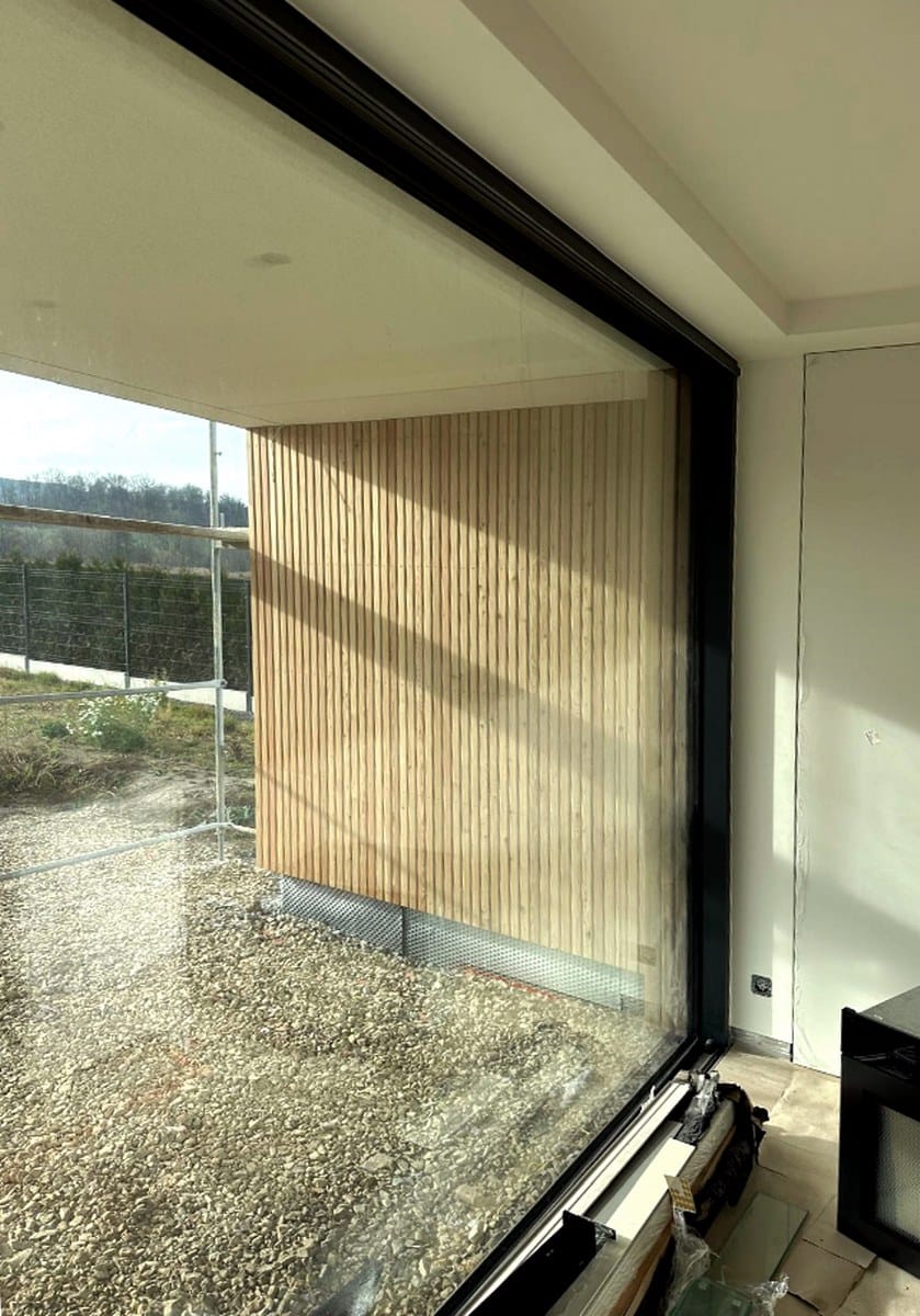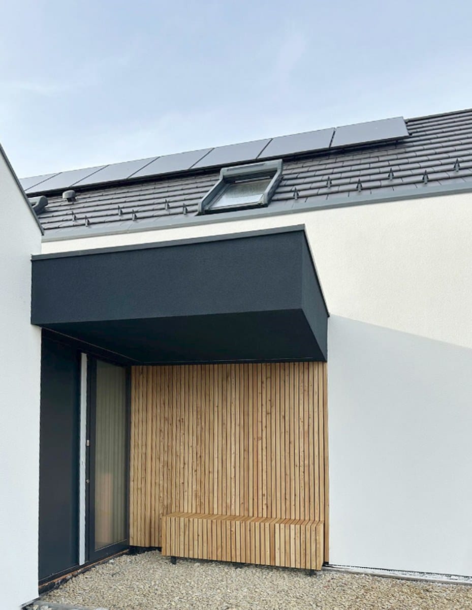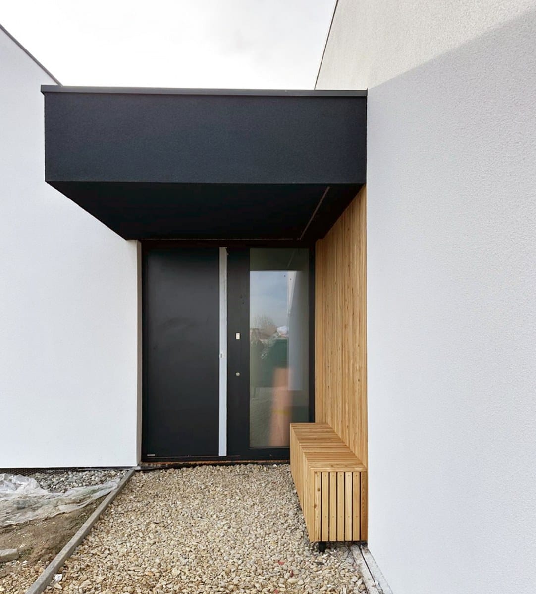 „Stodoły” zostały przesunięte względem siebie, dzięki czemu stworzono dwie osłonięte przestrzenie zewnętrzne: półprywatny placyk wejściowy z zadaszonym miejscem na poranną kawę czy spotkania z sąsiadami oraz duży, częściowo zadaszony prywatny taras dla rodziny, otwarty na część rekreacyjną działki – intymny ogród. Takie ukształtowanie formy budynku pozwoliło uzyskać niewielką skalę domu i ciekawą przestrzeń wokół budynku.