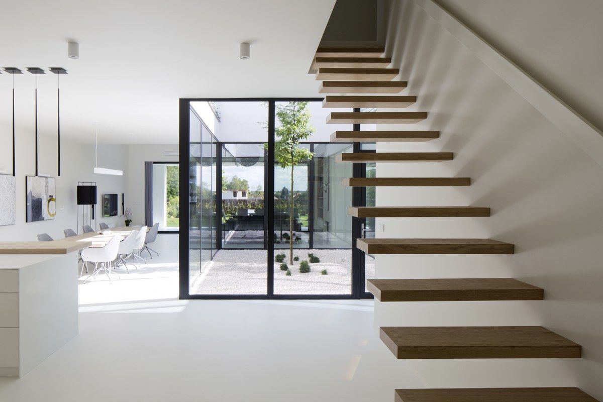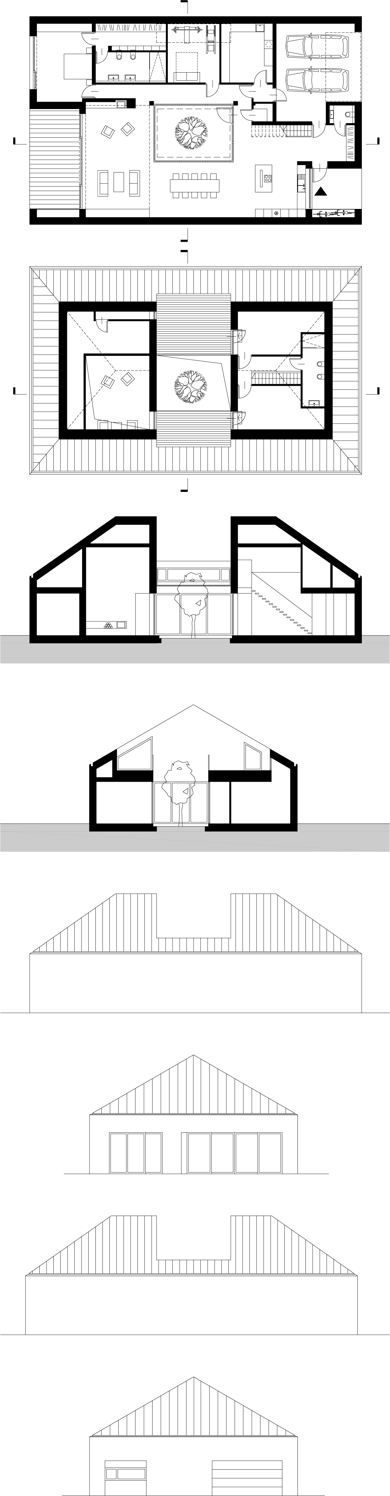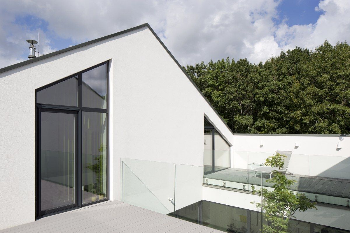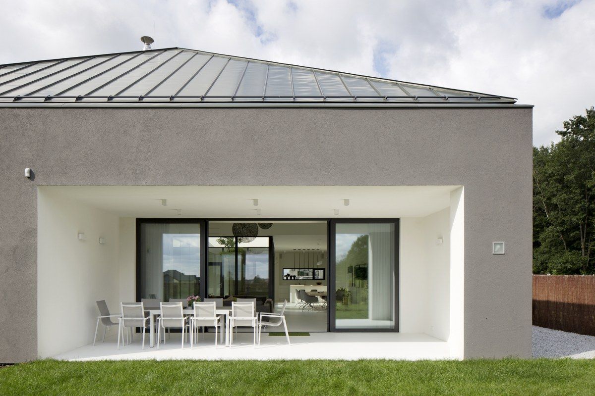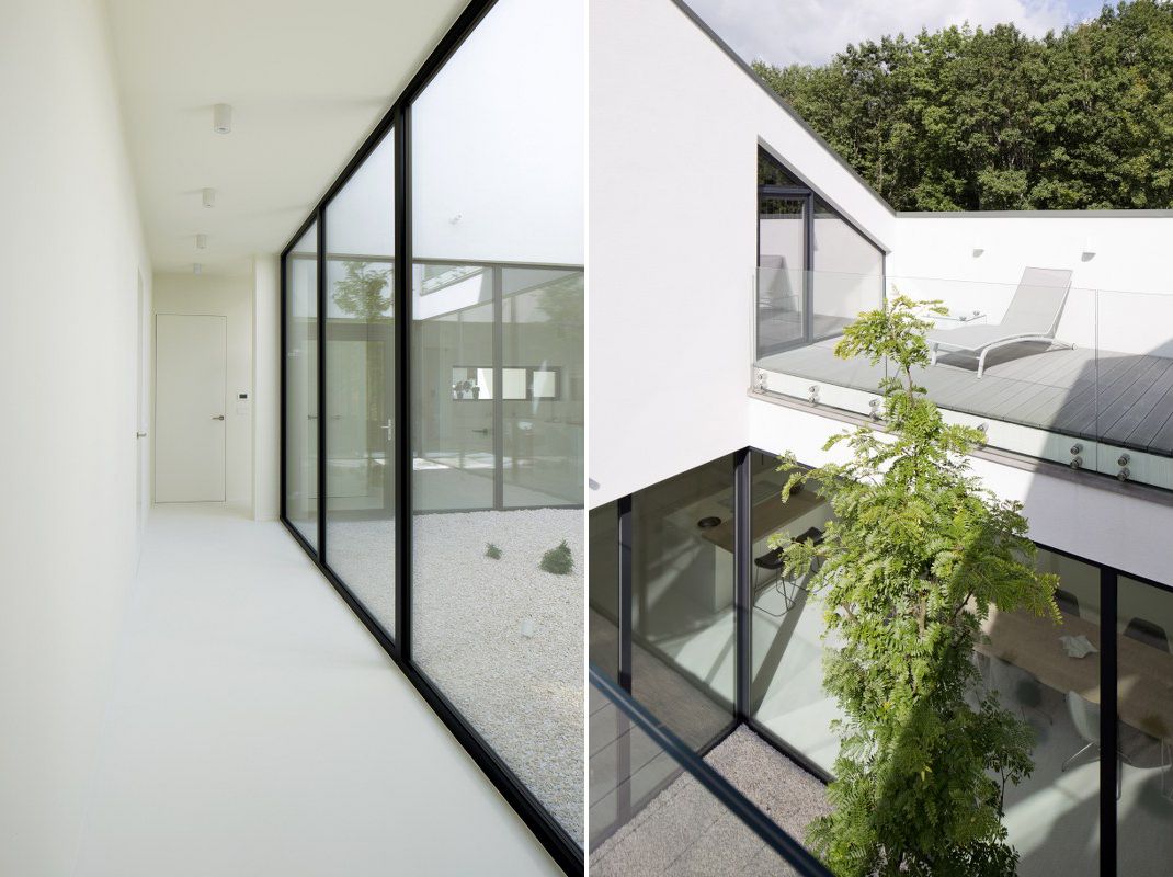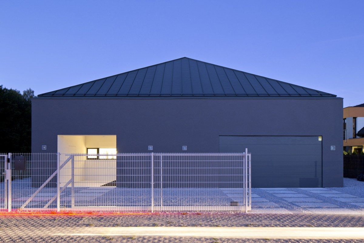 Z prostopadłościennej kostki nakrytej spadzistym dachem wycięli fragment w kształcie przestrzennej strzałki, dzięki czemu otrzymali atrium doświetlające wnętrze. Bo bokach wycięto dwie prostopadłościenne formy, a w uzyskanych w ten sposób otworach umieszczono wjazd do garażu z jednej strony, z drugiej duże przeszklenia.Te rozwiązania architektoniczne pozwoliły otworzyć perspektywę na otaczający las i nasycić budynek światłem odbitym przy jednoczesnym pozbawieniu elewacji okien"