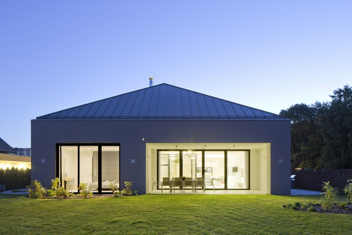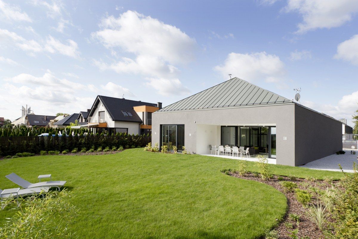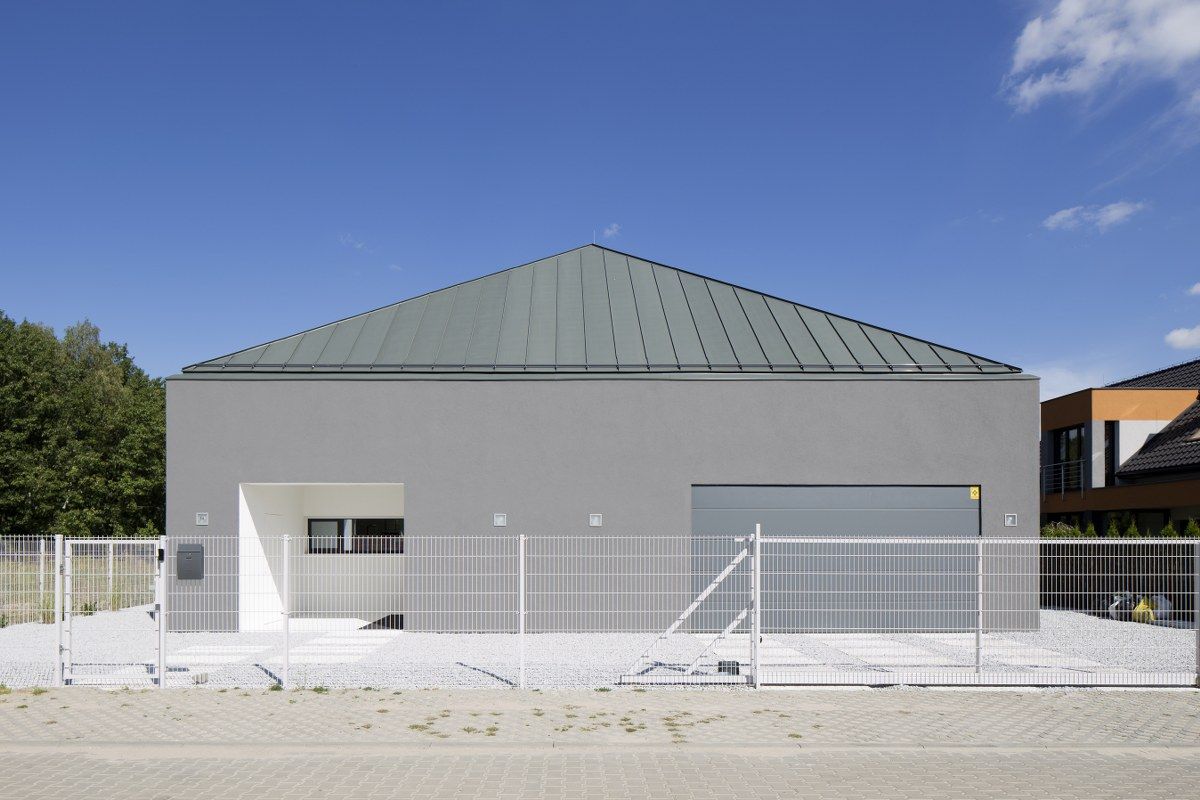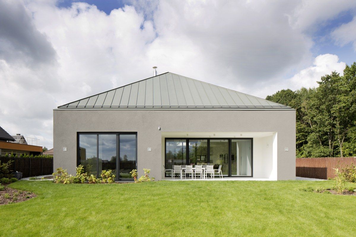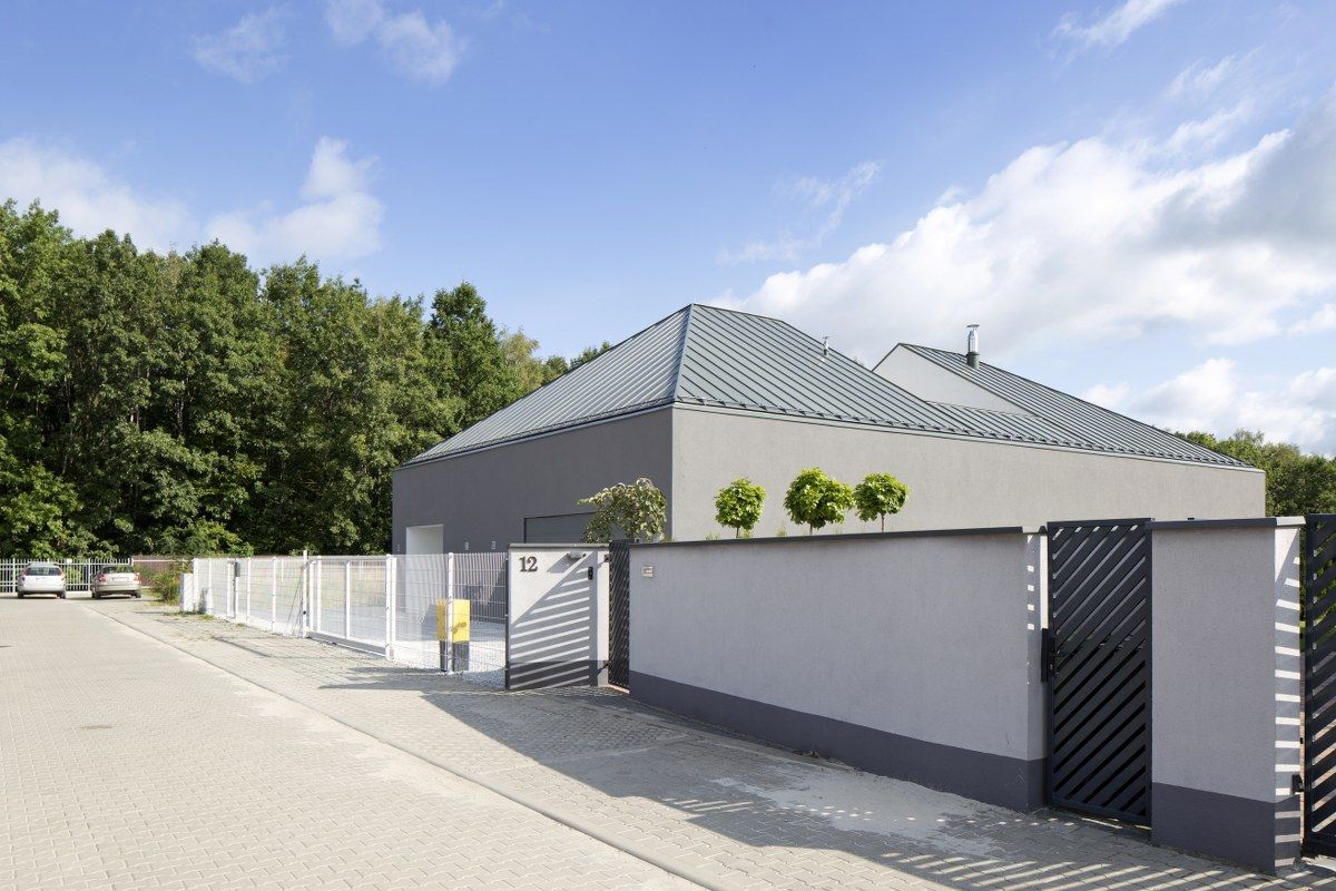 "Działka położona jest w bliskim sąsiedztwie lasu, ale jednocześnie wśród gęstej zabudowy jednorodzinnej. Lokalizacja wśród otaczającej zabudowy jednorodzinnej oraz widok na las wyznaczyły kierunek kształtowania budynku. Architekci zdecydowali się na zaprojektowanie rozłożystego budynku o łącznej powierzchni 280 metrów kwadratowych. Dom w parterze odcina się od sąsiadów poprzez brak okien w ścianach bocznych, jego wnętrze doświetlone jest przez wewnętrzne atrium" - pisze Portal Bryła.pl