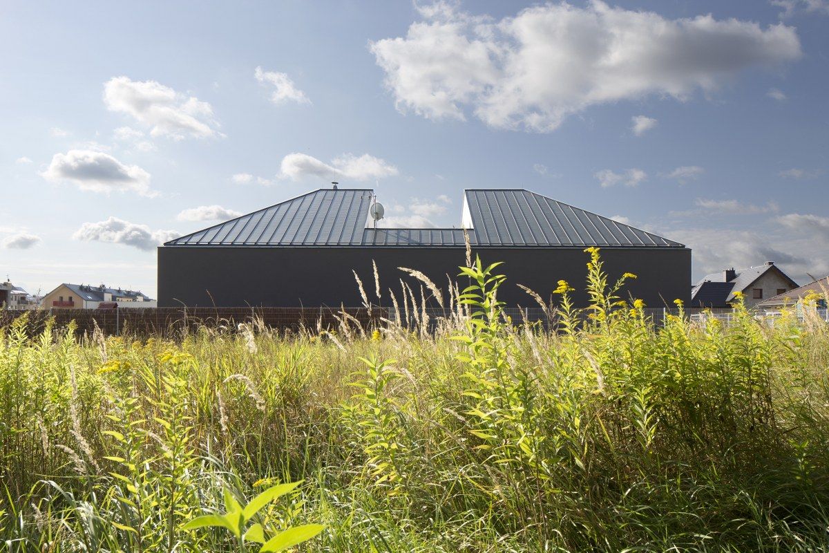 "Czterospadowy, symetryczny dach budynku wykonano z grafitowej blachy aluminiowej na rąbek stojący. Zestawienie kolorystyki materiałów uwypukla charakter formy. Zamkniętość została podkreślona ciemną barwą tynku, natomiast elementy wchodzące w skład otwartego środka budynku oznaczono barwą białą. Jasne ściany centralnie położonej „studni” sprawiają, że do pokoi wpada duża ilość naturalnego światła odbitego, co sprawia, że mimo braku dużej ilości okien wnętrza są dobrze doświetlone."