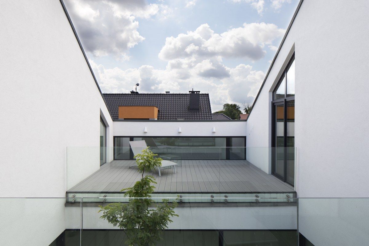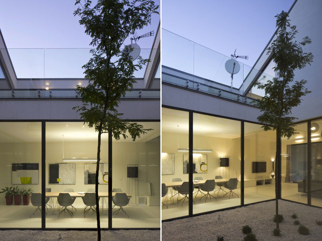 "W związku z niewielkimi odległościami pomiędzy sąsiednimi zabudowaniami architekci zaproponowali układ domu skierowany dośrodkowo. Z tradycyjnej formy prostopadłościanu z dachem spadzistym wycięto kubaturę w kształcie ekstrudowanej pionowej strzałki tworząc otwarty tarasowy układ. Centralnym punktem stało się wewnętrzne patio położone na parterze. Doświetla ono wnętrza oraz daje możliwość wypoczynku na świeżym powietrzu w poczuciu prywatności. Nad atrium znalazły się dwa tarasy z dostępem z sypialni, stanowiące otwarcia na otaczające widoki." - pisze portal sztuka-architektury.pl