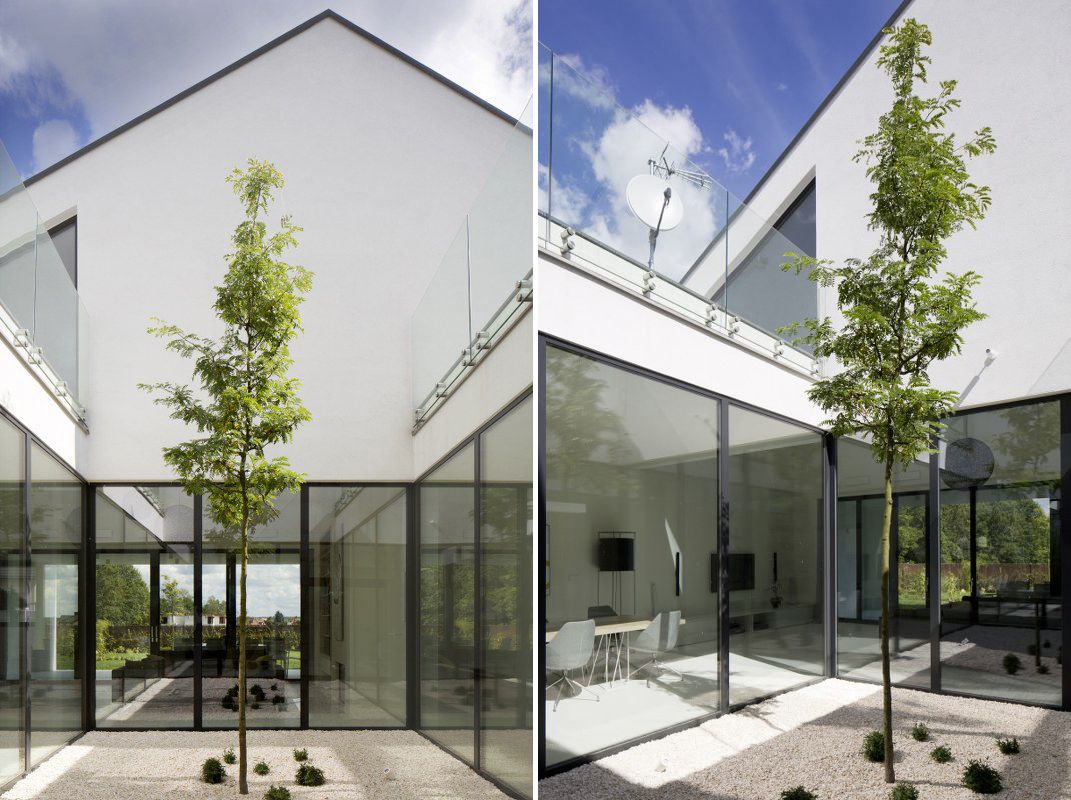 "Elewacja budynku spełnia rolę pozbawionego okien bufora chroniącego mieszkańców przed czynnikami zewnętrznymi. Jedyne otwarcia występują od strony ogrodu położonego w głębi działki. Frontowa elewacja posiada dodatkowo wgłębienie zadaszające wejście do budynku. Ściany wewnętrznego dziedzińca są w całości przeszklone, dzięki czemu układ domu zyskał dodatkową przejrzystość."