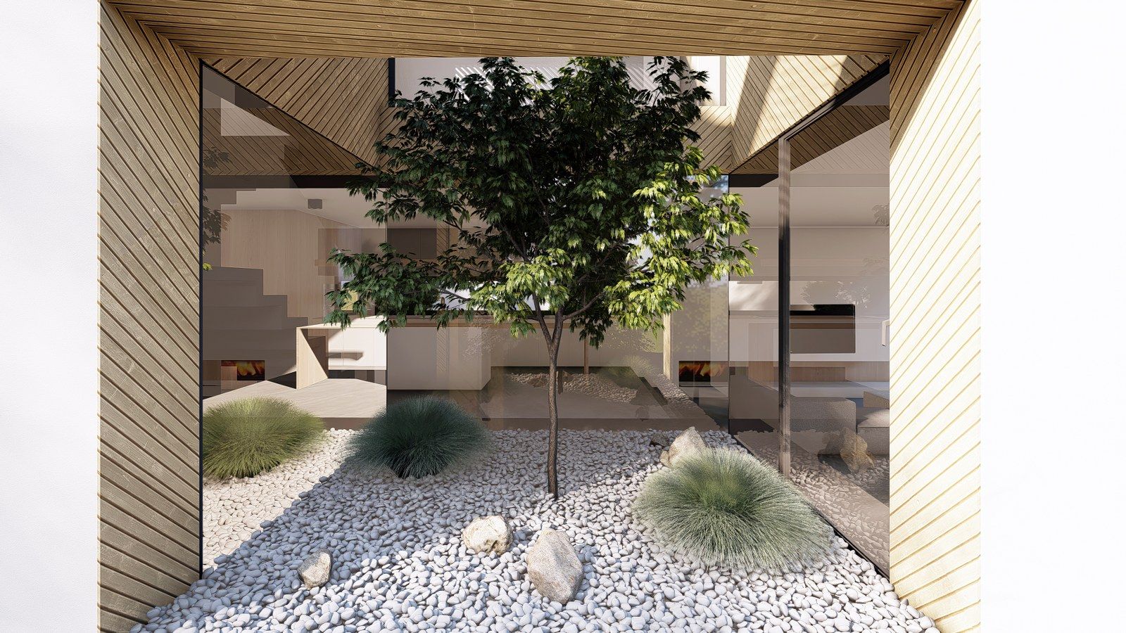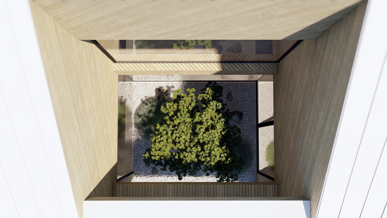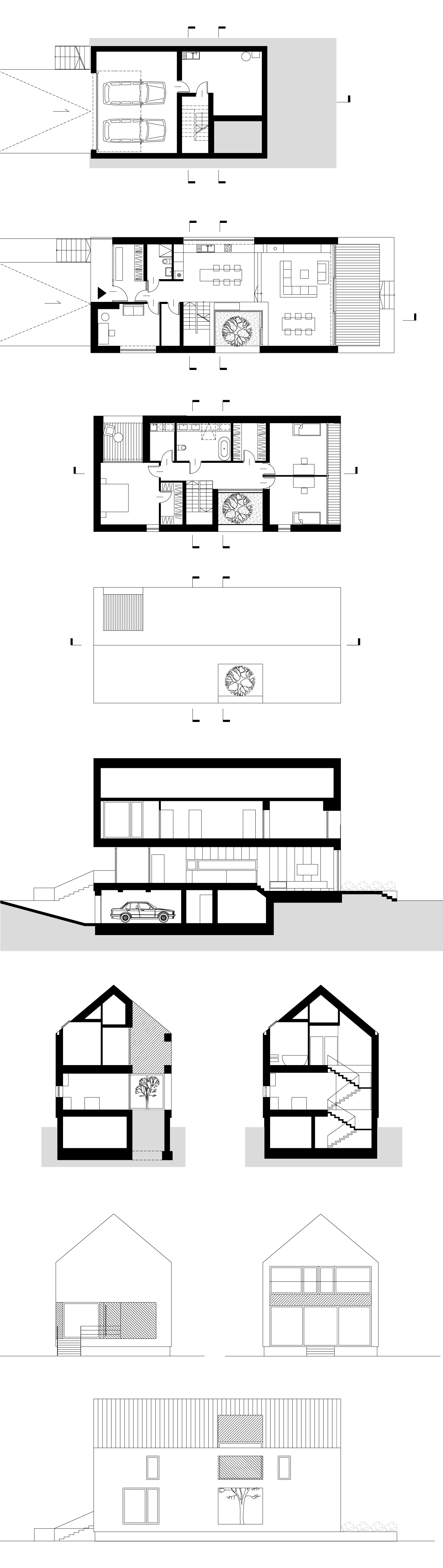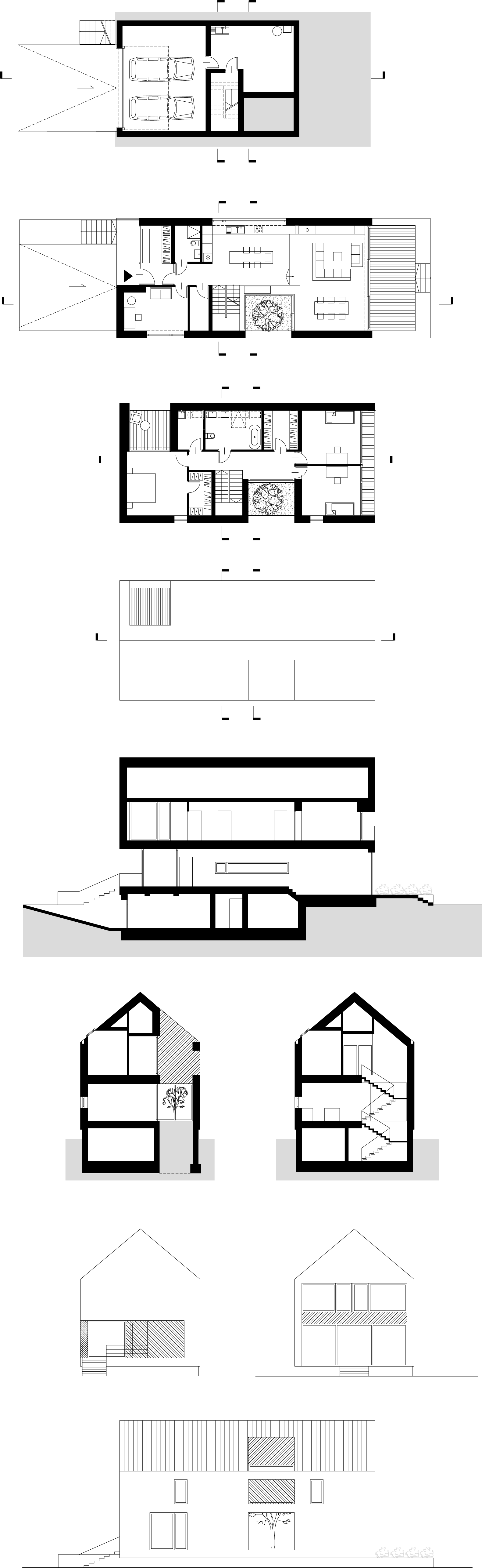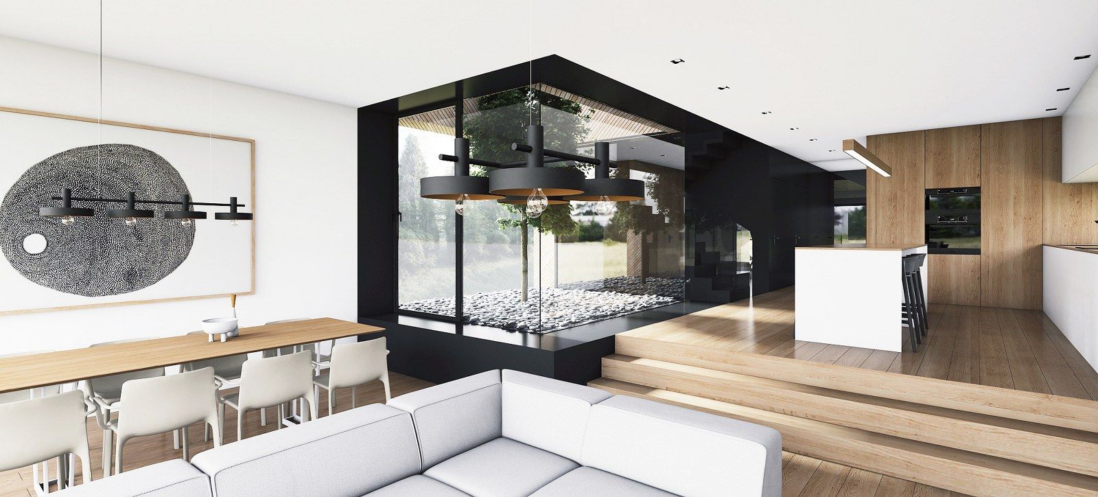 Kształt budynku narzuciła geometria i wymiary działki oraz rozbudowany program funkcjonalny. Zaprojektowany dom musiał być wąski i długi. Architekci urozmaicili jednak podłużną formę wycięciami w bryle domu – wejściem, atrium, które 'dziurawi’ dach oraz ukrytym tarasem dostępnym z sypialni. Pożądane przez Inwestorów naturalne światło dociera do wnętrz między innymi poprzez 'dziurę w dachu’, które na dolnej kondygnacji tworzy efektowne atrium wypełnione zielenią.