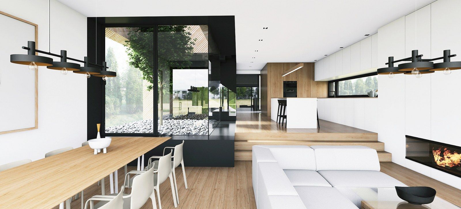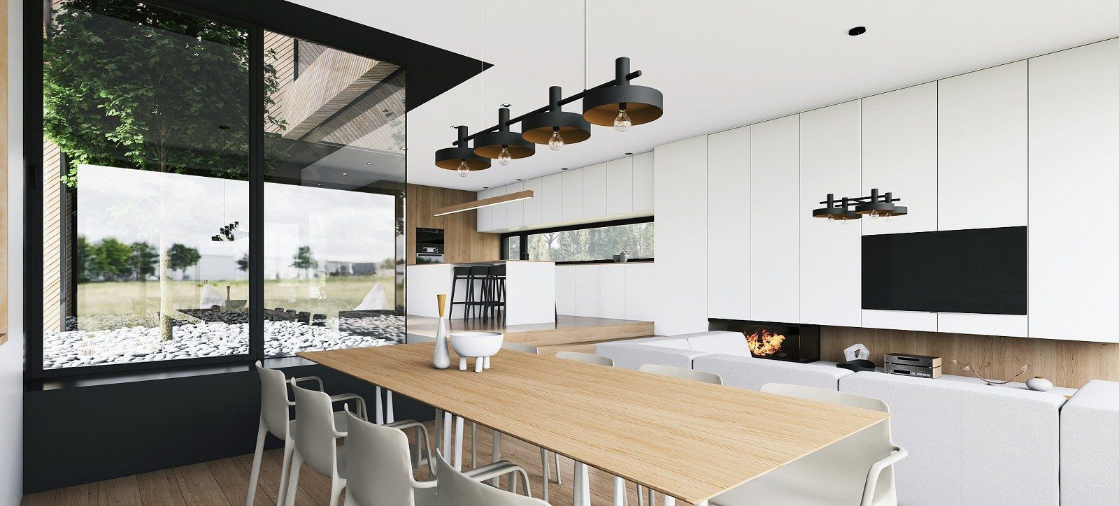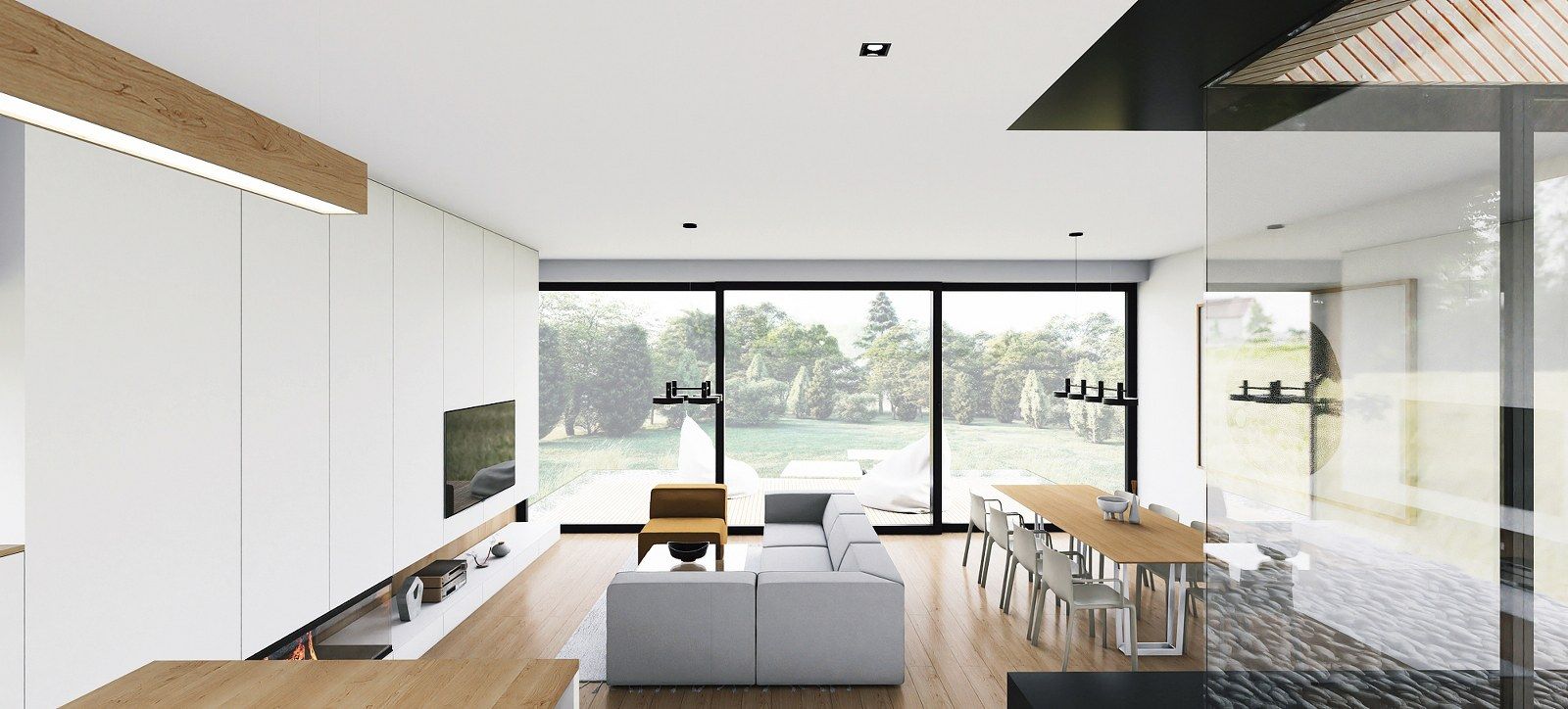 Wnętrza domu nawiązują kolorystycznie do jego elewacji. Przestrzeń wykończona została w beli i drewnie. Ciemne, kontrastujące elementy wyposażenia korespondują z czarnymi ramami efektownych dużych przeszkleń, które otwierają wnętrza na najbliższe otoczenie.