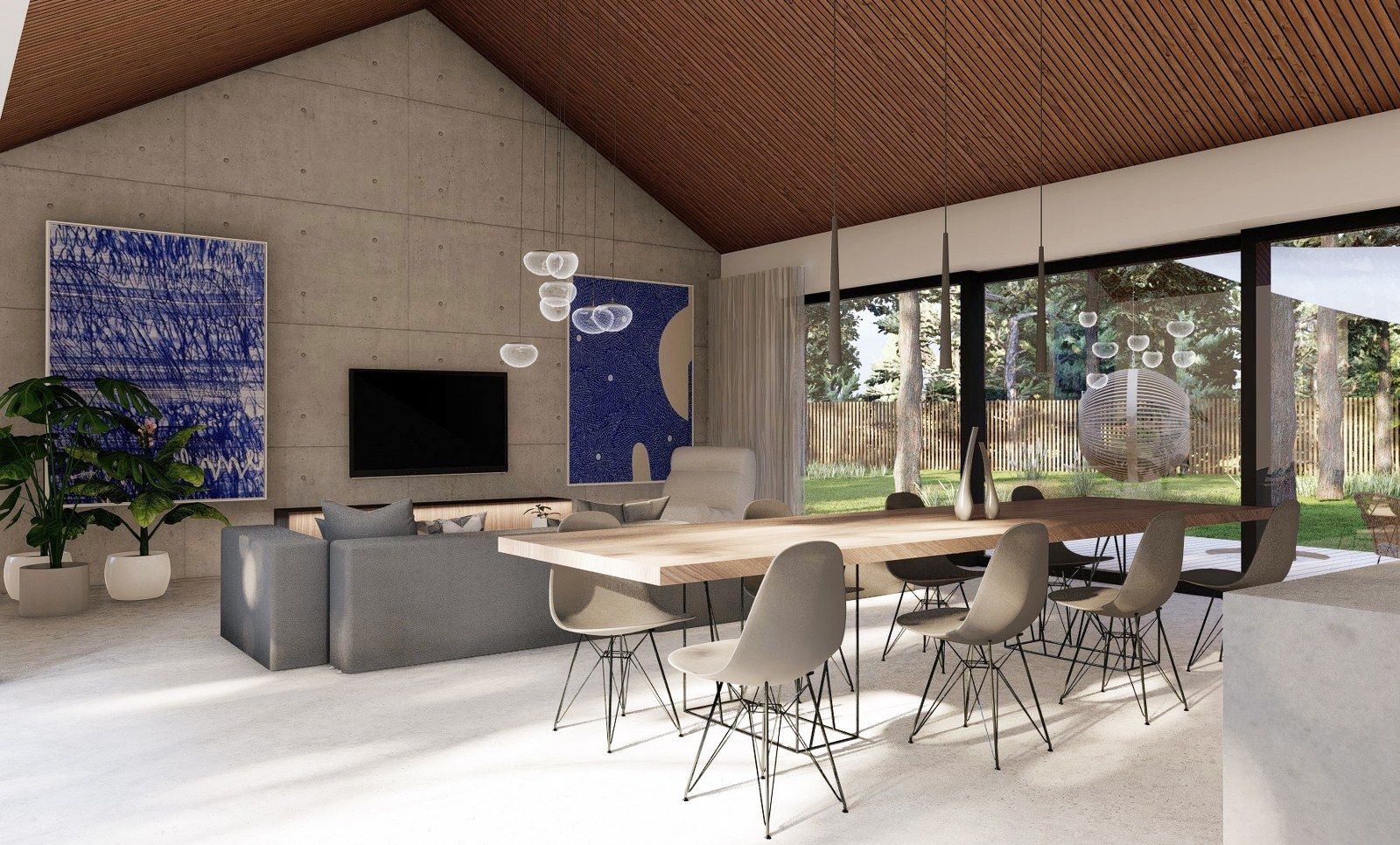W efekcie powstała przestrzeń, w której wnętrze przenika się z zewnętrzem. Duże przeszklenia otwierają dom na las, a zapach sosnowych igieł unosi się tuż za progiem.