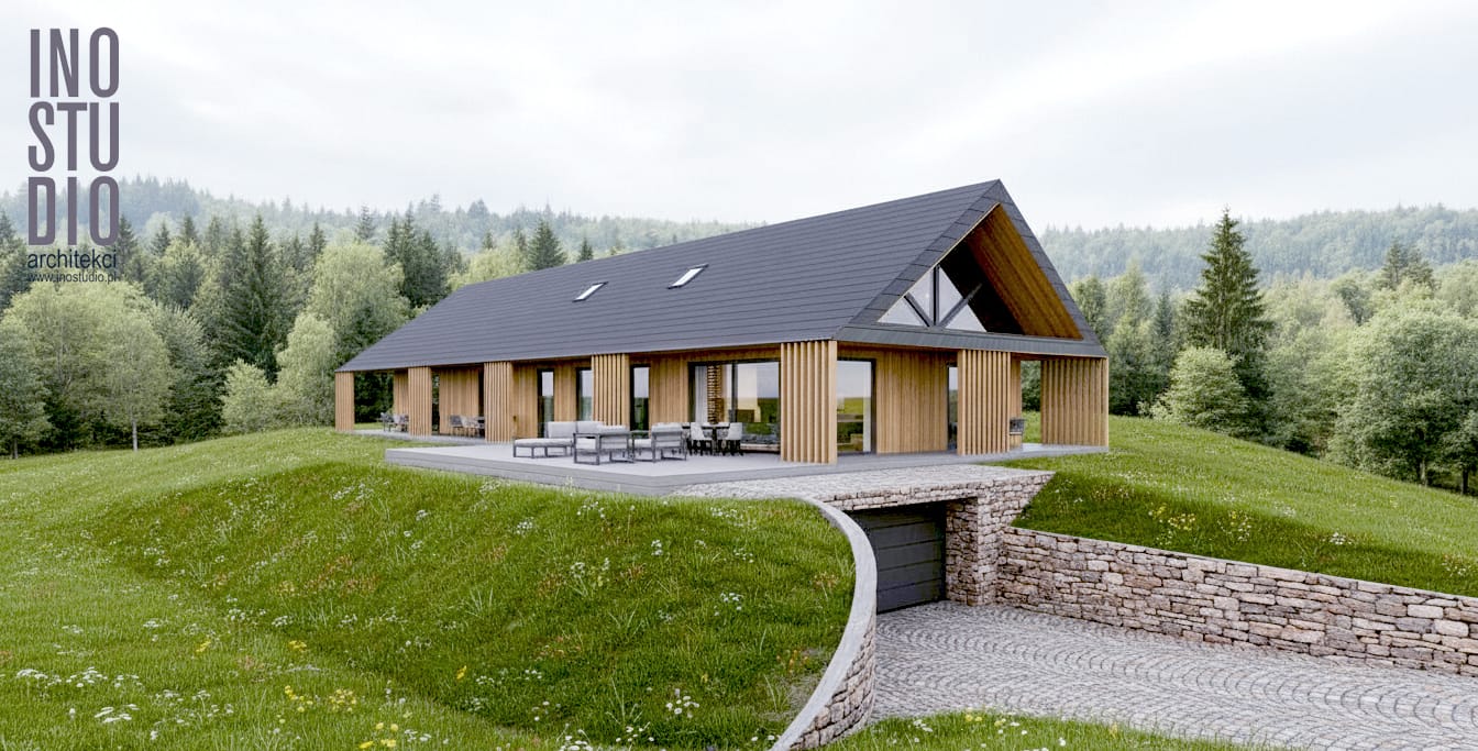 Inwestor oczekiwał domu parterowego, wizualnie niskiego i płaskiego, jednocześnie mając działkę w dość dużym spadku, również otwarcie domu na widok, który znajduje się od strony południowej — dokładnie tam, gdzie przebiega droga dojazdowa. Projekt wymagał więc od nas precyzyjnego ukształtowania bryły i terenu, aby dom korzystał z panoramy gór, a jednocześnie zapewniał prywatność i odcięcie od drogi.