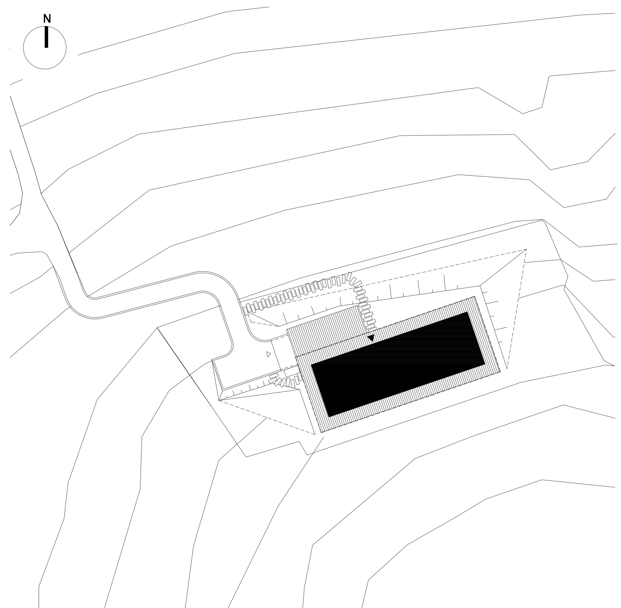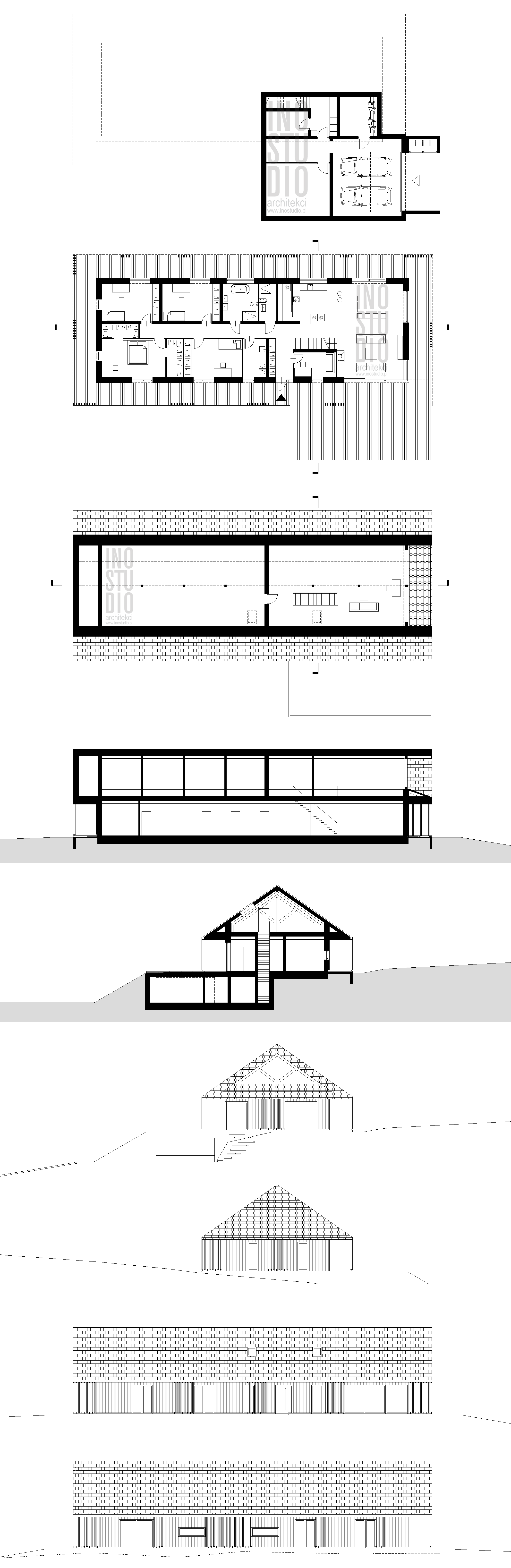 Dom teoretycznie składa się z dwóch kondygnacji: przyziemia z garażem oraz parteru. Ponieważ jednak parter jest bardzo długi, rozciągnięty horyzontalnie a kondygnacja podziemna obsypana została ziemią udało się uzyskać efekt długiego, jednokondygnacyjnego, rozciągniętego horyzontalnie budynku. Linia budynku jest niska, spokojna i miękko wpisuje się w ukształtowanie terenu. Wzdłuż elewacji zaprojektowaliśmy zadaszone obejście, które pozwala „powiększyć” funkcję domu pod dachem i tworzy naturalne przejście między wnętrzem a otoczeniem. W części poddaszowej znajduje się również antresola doświetlona dużymi przeszkleniami.