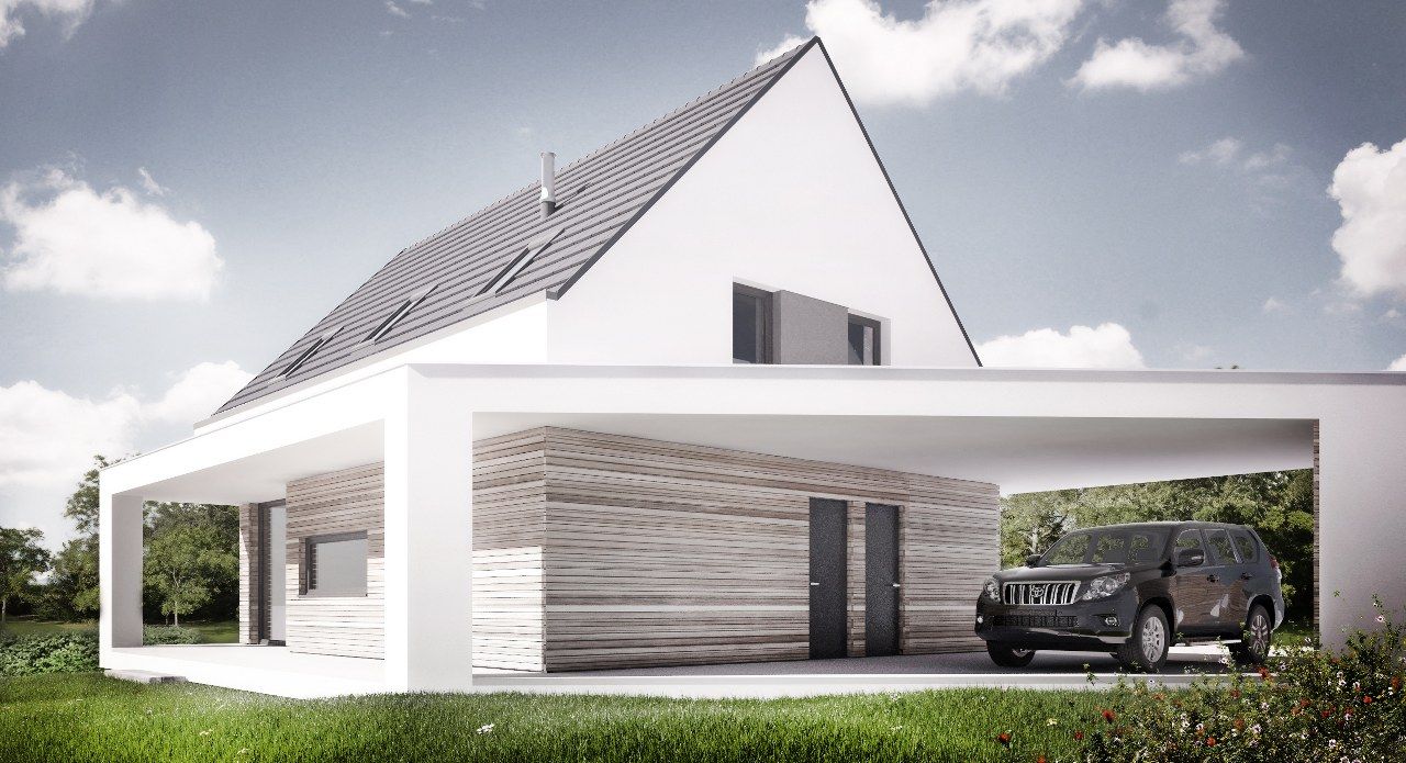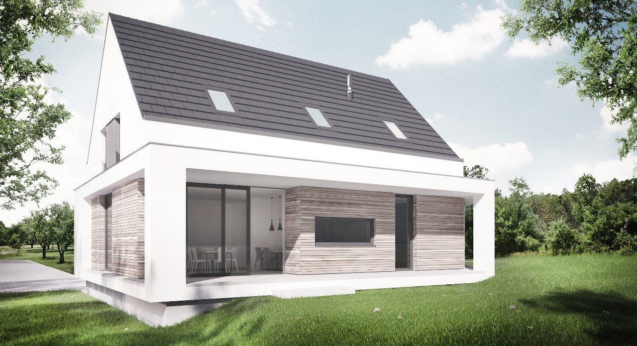 Dodatkowe potrzeby inwestora związane z przyszłym zagospodarowaniem działki skierowały nasze myślenie na dom będący połączeniem dwuspadowej tzw „stodoły” z parterowym „pudełkiem” z płaskim dachem, tworzącym podcień-obejście wokół domu w parterze. Podcień-obejście łączy wszystkie funkcje otwarte i zamknięte w parterze budynku: podcień wejściowy, taras od strony ogrodu, wiatę garażową oraz budynek gospodarczy.