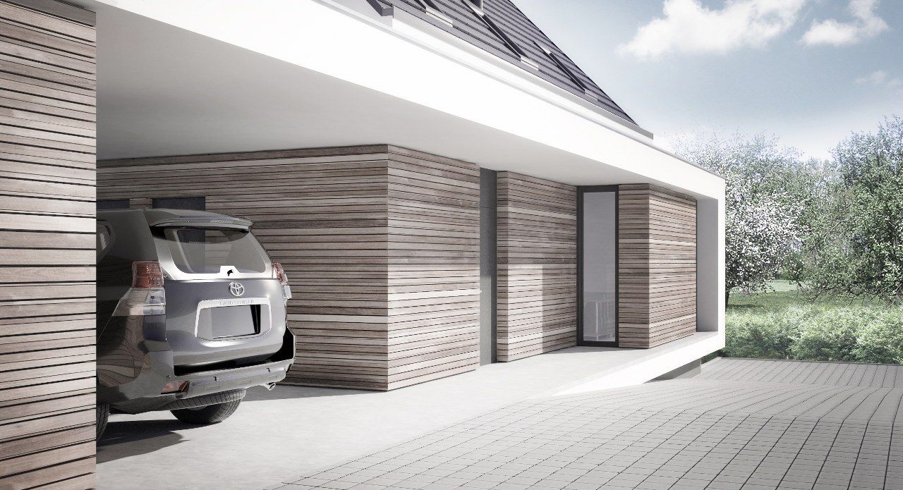 Budynek został tak ułożony na działce aby odpowiednio wydzielał strefę utwardzoną z wjazdem przy wejściu do domu od intymnej części rekreacyjnej ogrodu. Dla poczucia prywatności od strony wejściowej budynek ma mniejsze okna i pełne ściany, natomiast otwiera się dużymi przeszkleniami na ogród oraz stronę południową.