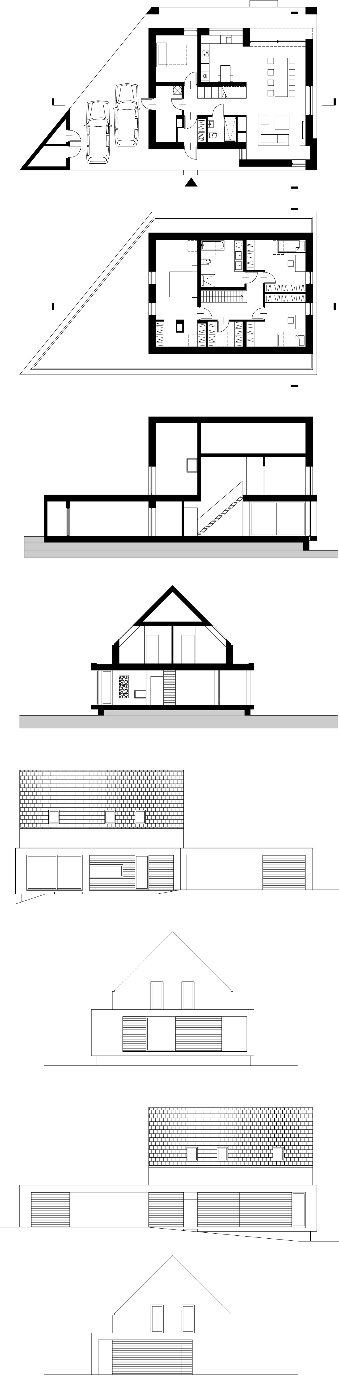 Nietypowy kształt działki wynika z przebiegającej pod skosem linii kolejowej. To ograniczenie było dość dużym utrudnieniem ze względu na brak możliwości zabudowy działki w odległości 20m od linii kolejowej. Uwarunkowania lokalizacyjne działki, jej wielkość i kształt stały się podstawą naszego projektu.