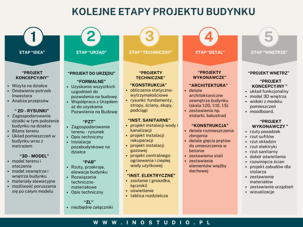 Projekt domu składa się z kilku części. Są to części następujące po sobie, nie nakładają się na siebie. Każdy kolejny etap, rozpoczyna się po zakończeniu wcześniejszego i jest jego uszczegółowieniem.