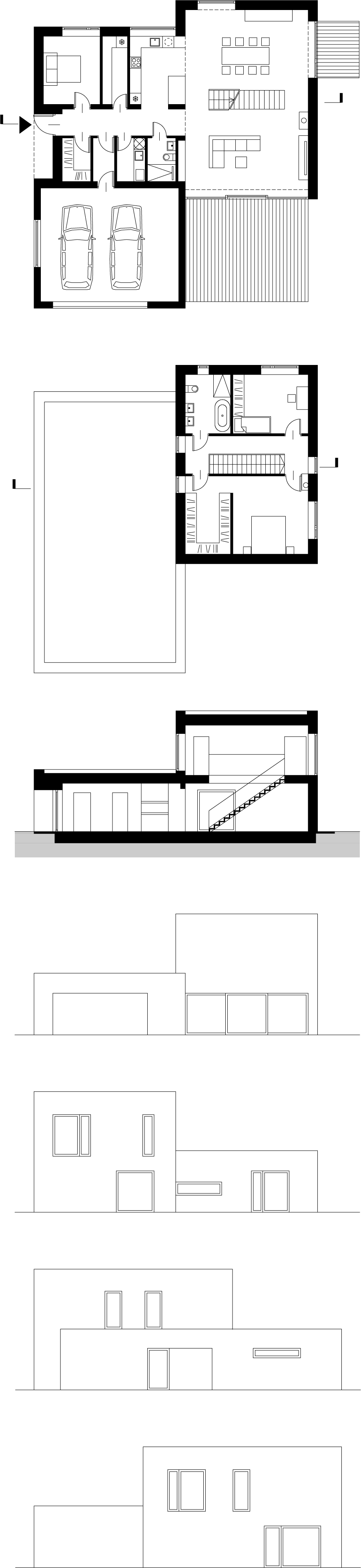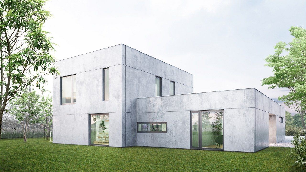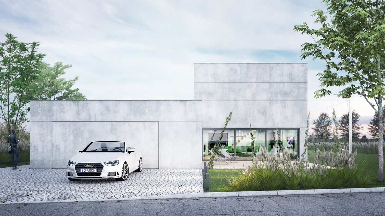 "Architekci zaprojektowali betonowy dom składający się z dwóch brył, „pudełek” z płaskim dachem. W niższym pudełku znajduje się w garaż, pomieszczenie pomocnicze, korytarz, pracownia i kuchnia, w wyższym zaś umieszczono salon z jadalnią na parterze i sypialnie, garderobę oraz łazienkę na piętrze. Podzielenie budynku na dwie bryły o różnych proporcjach pozwoliło uzyskać niewielką skalę całego domu, zróżnicowanie elewacji i dobre wpisanie w działkę.