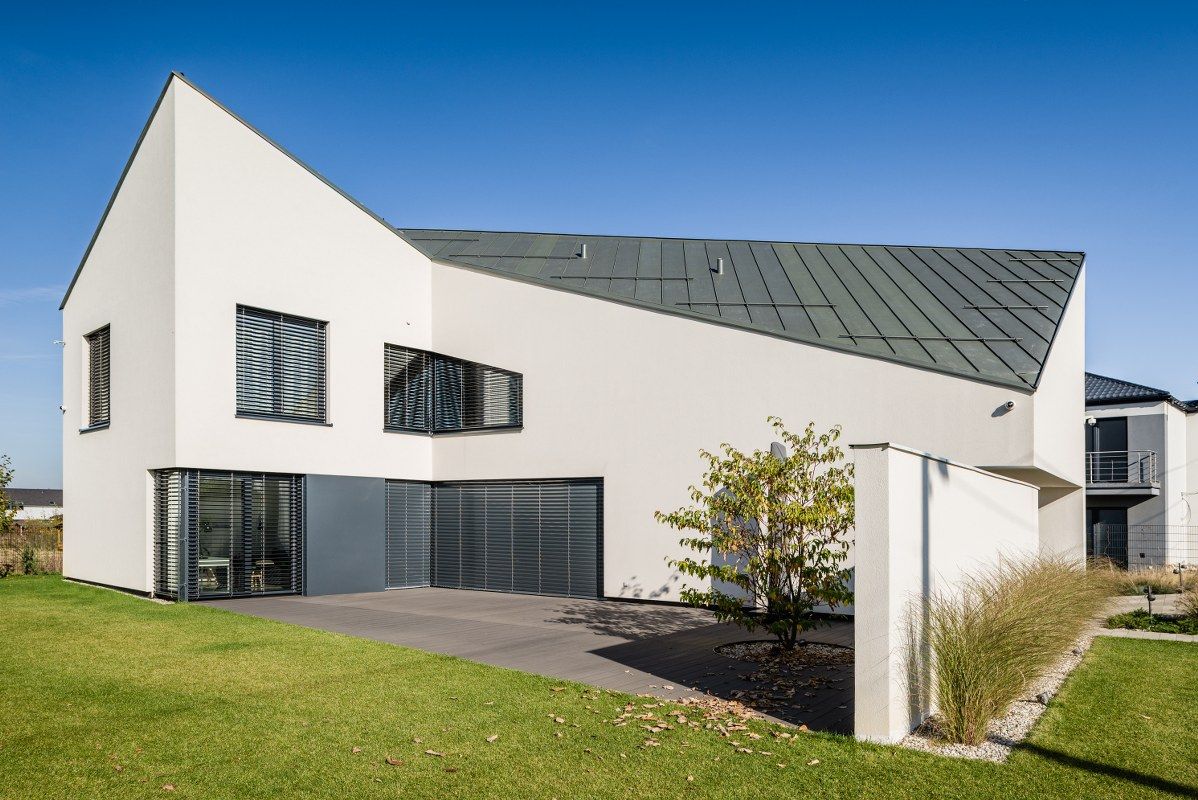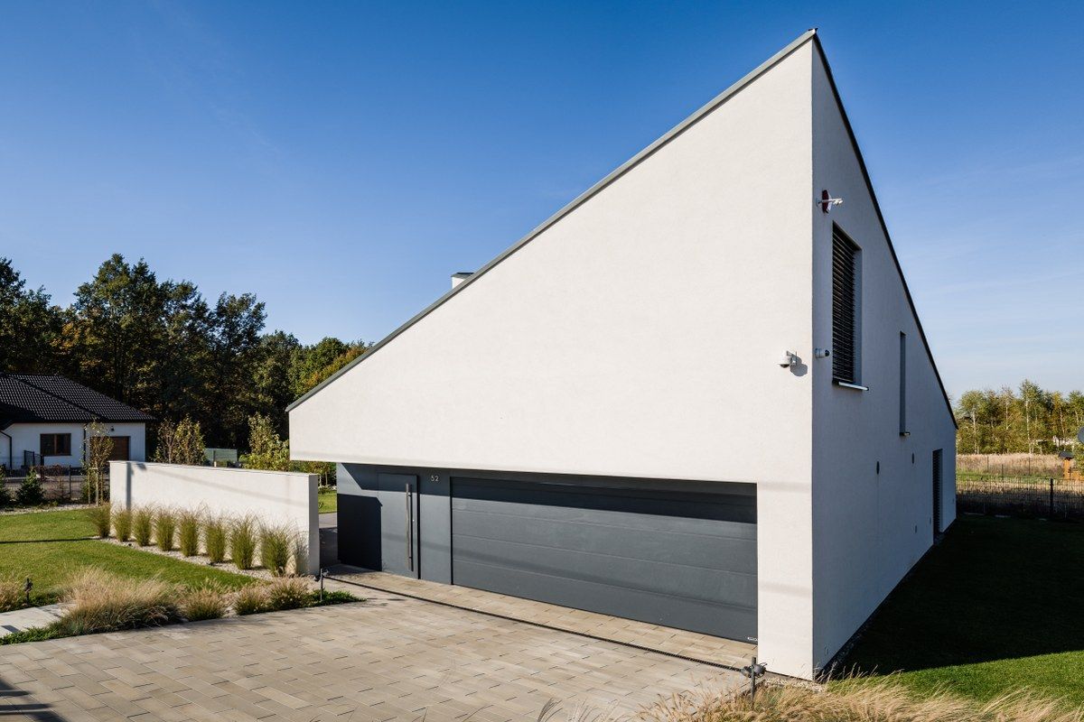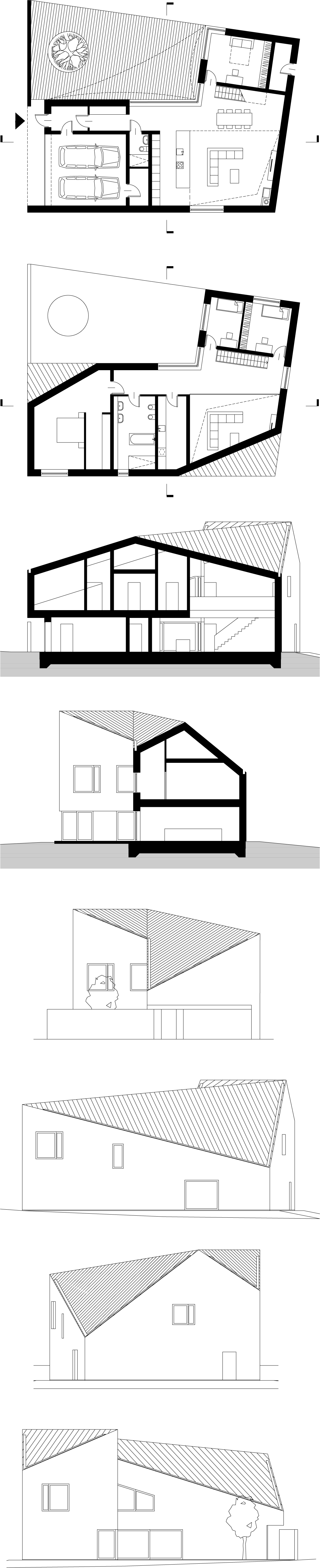 Front domu to tylko zapowiedź oryginalnego kształtu bryły. Jest przekryta asymetrycznym dachem spadzistym i wznosi się od wejścia w głąb działki. Architekci formowali ją, biorąc pod uwagę kierunki świata, widoki na pobliski las, tak aby większość funkcji umieścić w jak największej odległości od drogi dojazdowej."