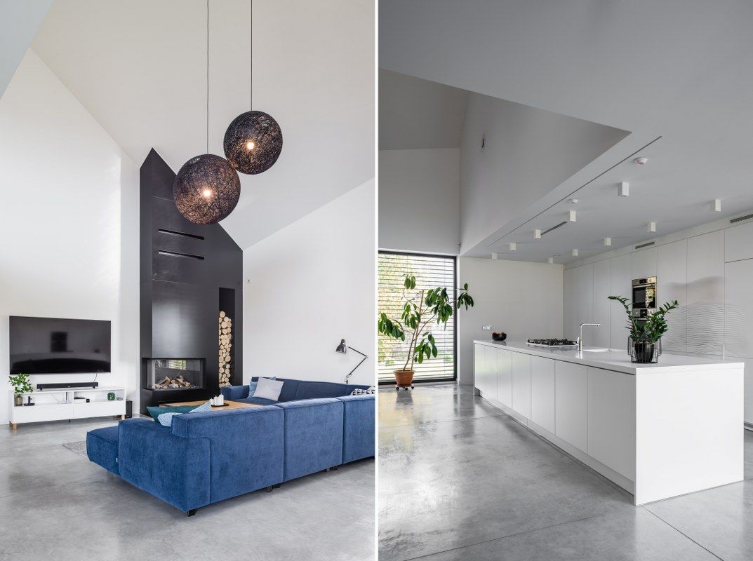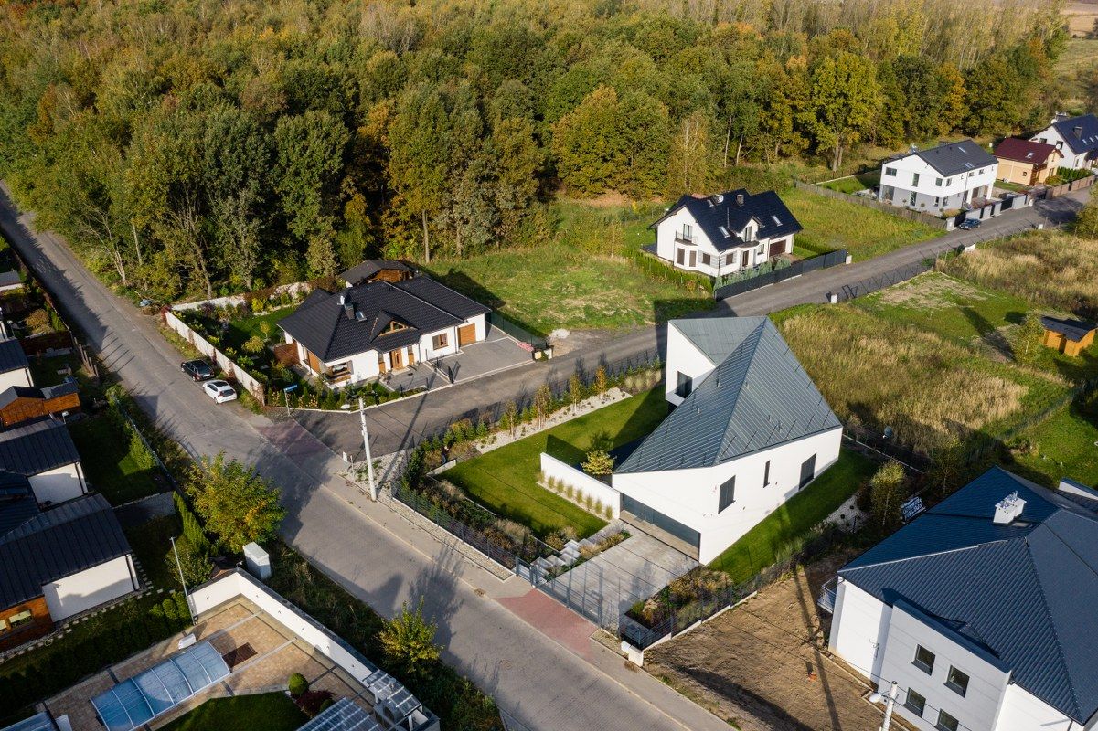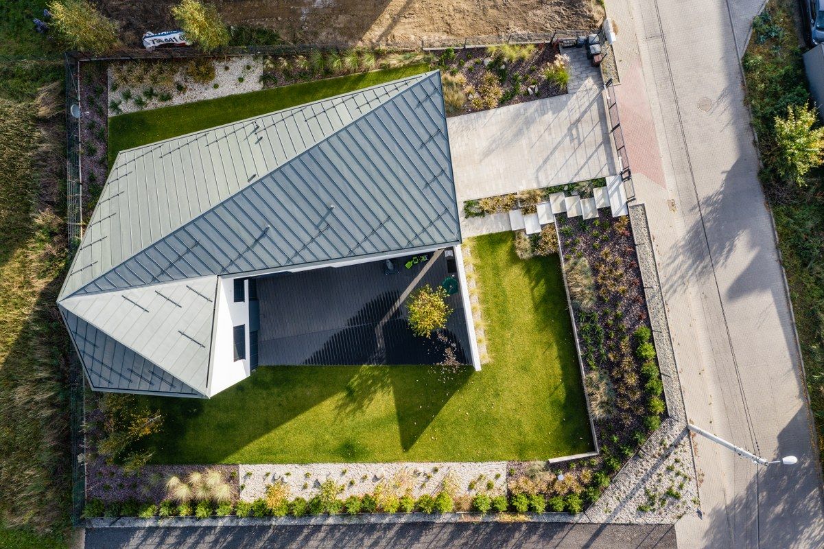 Na pierwszy rzut oka ten dom może się wydawać ekstrawagancki, jednak pozory mylą – to, co zdaje się wynikać z ekscentryczności, ma zupełnie inne źródło – zdroworozsądkowe. To, co powierzchownie dziwne, jest tak naprawdę praktyczne. Choć dom ma oryginalną bryłę, jej forma wynika przede wszystkim z bardzo funkcjonalnego podejścia do projektu. O jej kształcie przesądziło kilka czynników: kierunki świata, widoki i usytuowanie dwóch dróg dojazdowych. Podczas tworzenia schematu projektowego najpierw znaleziono optymalne miejsce bryły, zapewniające jak najlepszy widok – na las, następnie powiększono ją i tak formowano, by powstał osłonięty taras. Postanowiono obniżyć dom od frontu i podwyższyć z tyłu. Na koniec tak zaprojektowano połać dachu, by zapewnione było jak najlepsze nasłonecznienie dziedzińca i wnętrz. W efekcie postała rozrzeźbiona bryła przekryta asymetrycznym dachem." pisze Anna Okołowska, miesięcznik Murator