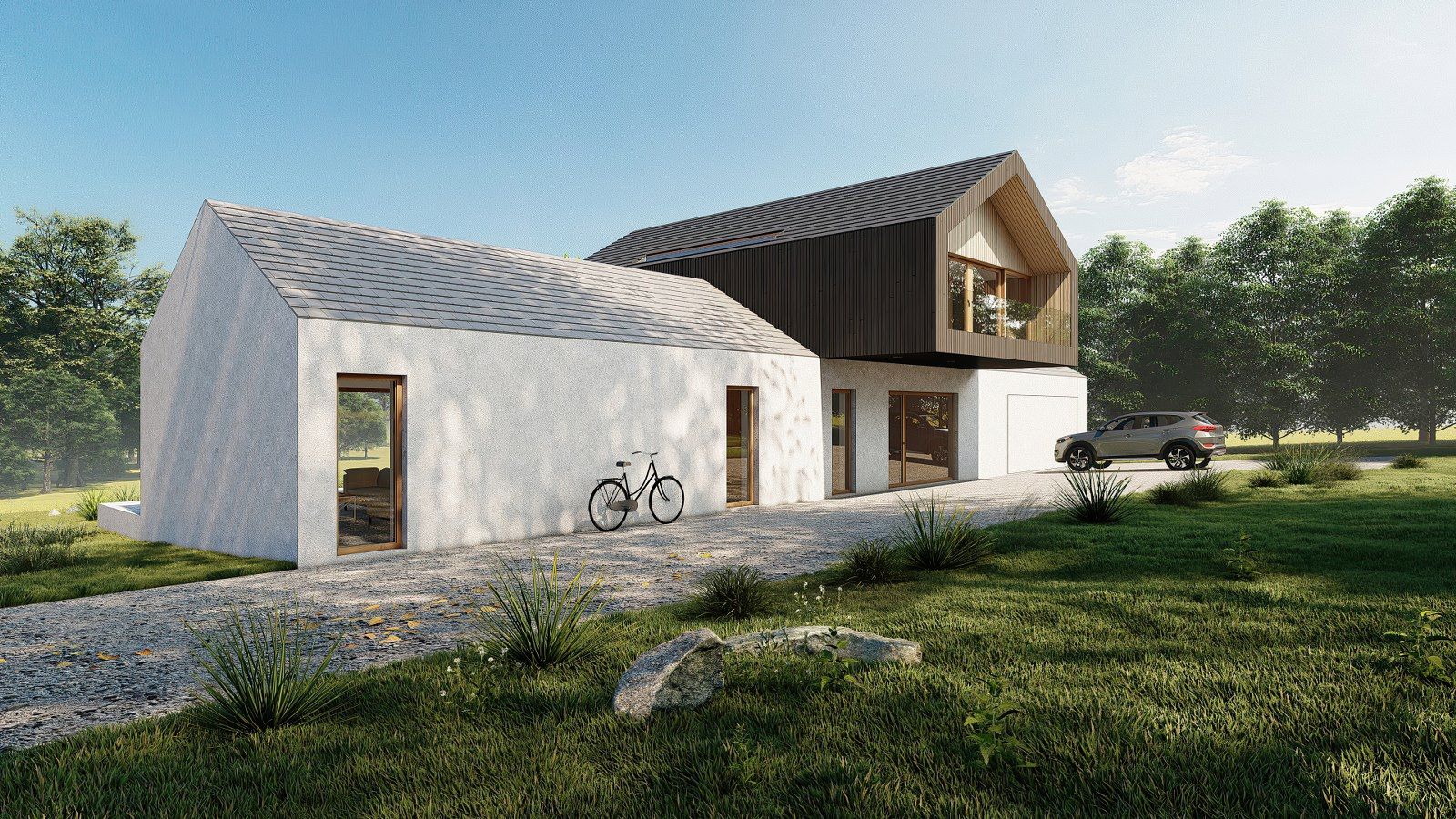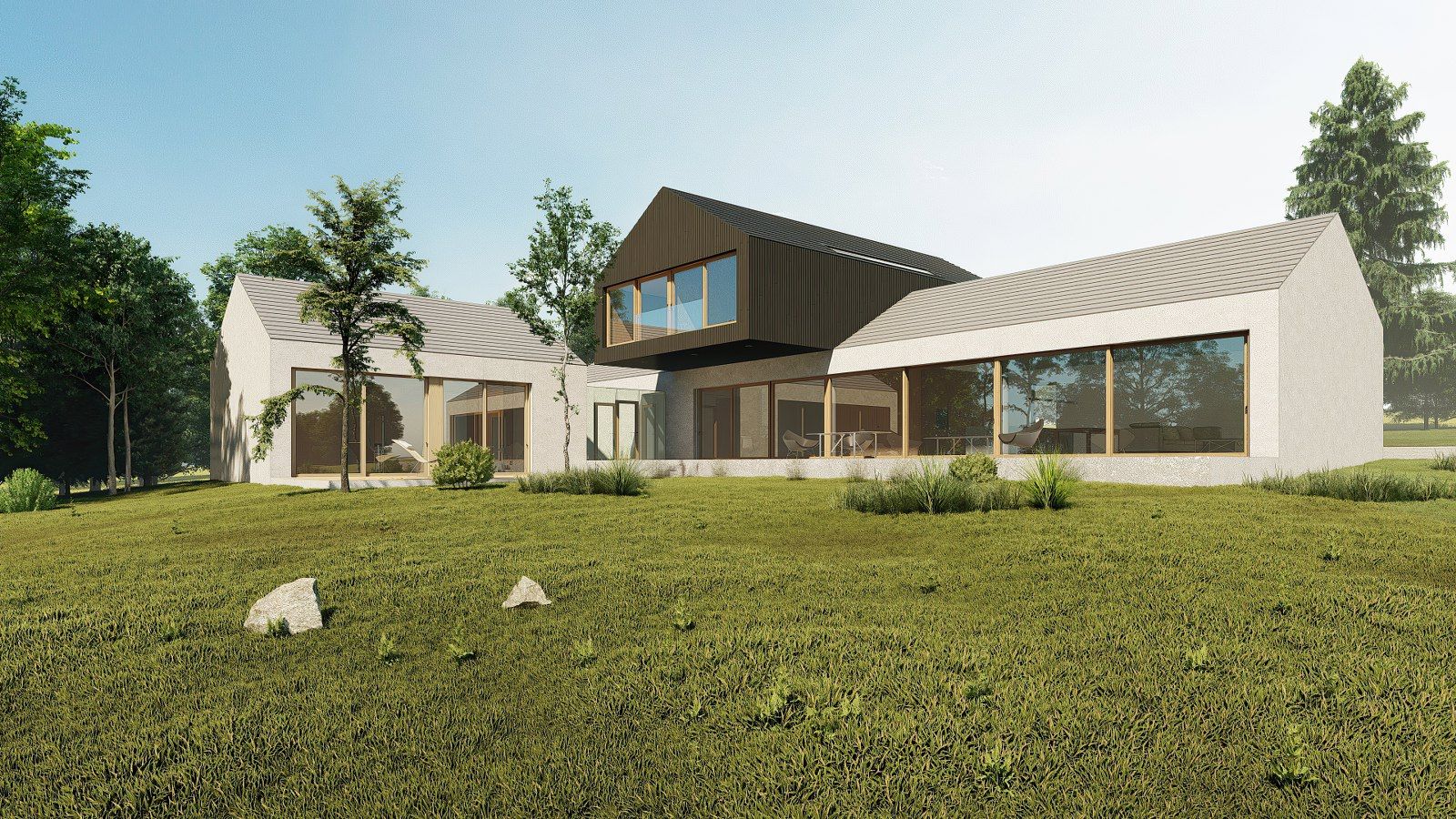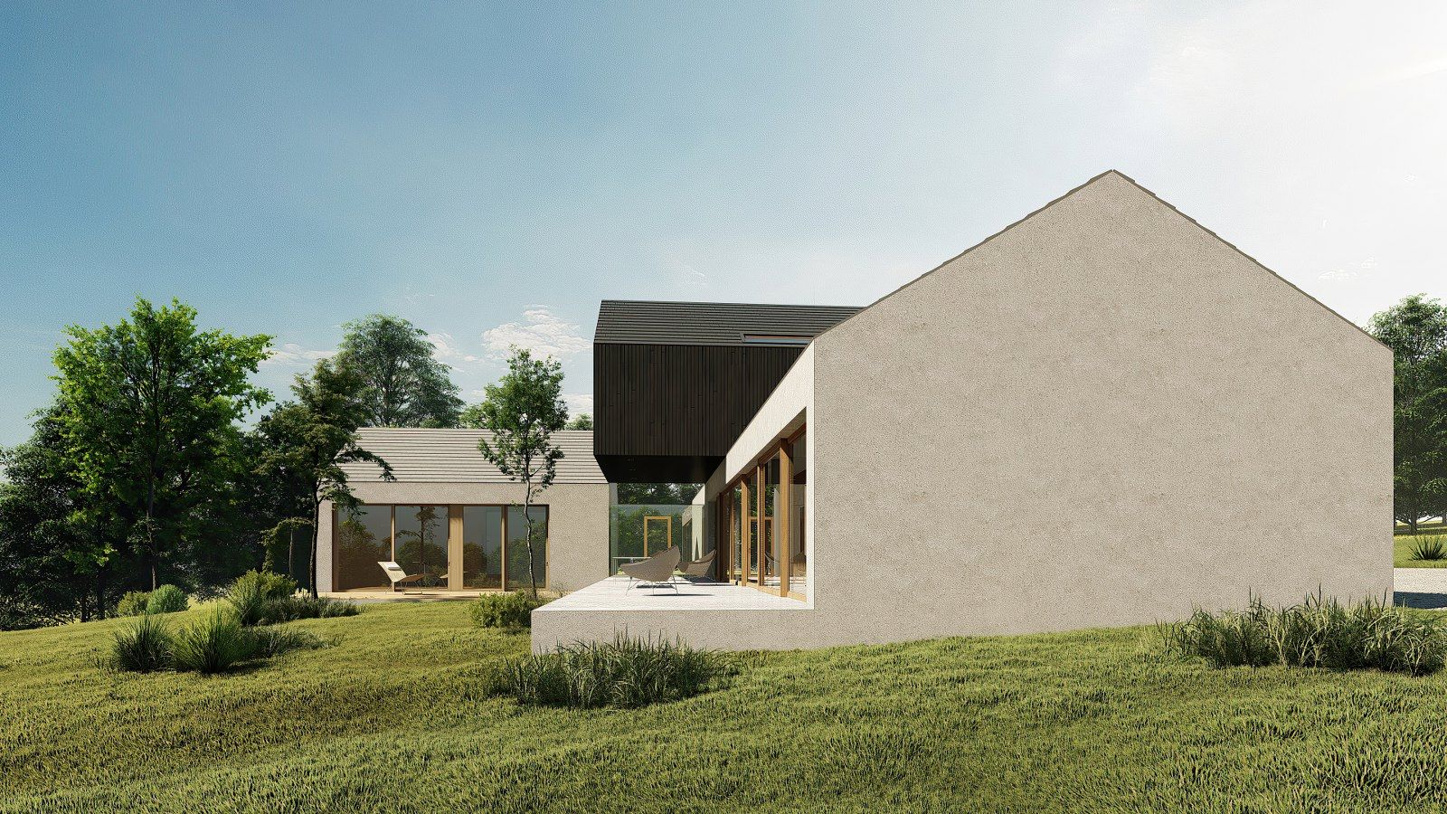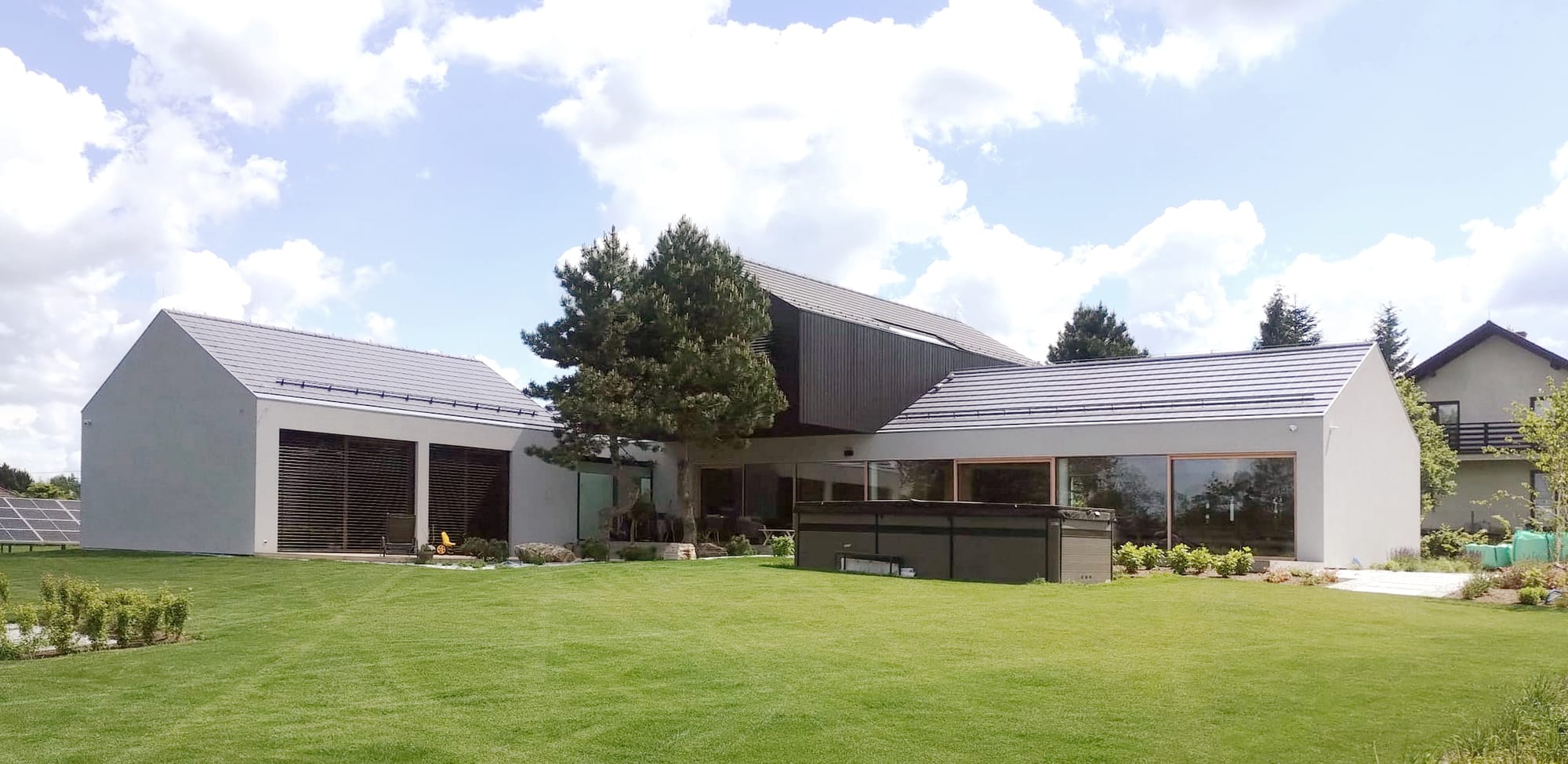 W projekcie postawiliśmy na współczesną, minimalistyczną formę architektoniczną, składającą się z trzech, wyraźnie zaakcentowanych brył. Dwóch na parterze, na kształcie litery L, w kolorach jasnej szarości oraz jednej “wiszącej stodoły” na piętrze, w brunatnej kolorystyce palonego drewna i ciemnej dachówki. Poprzez dodanie górnej, nadwieszonej części, horyzontalna bryła parteru zyskała dynamikę.