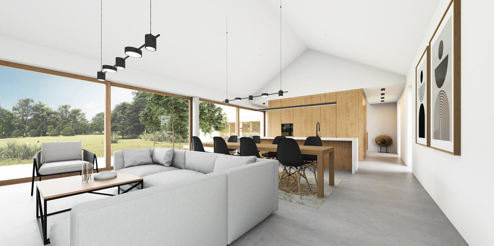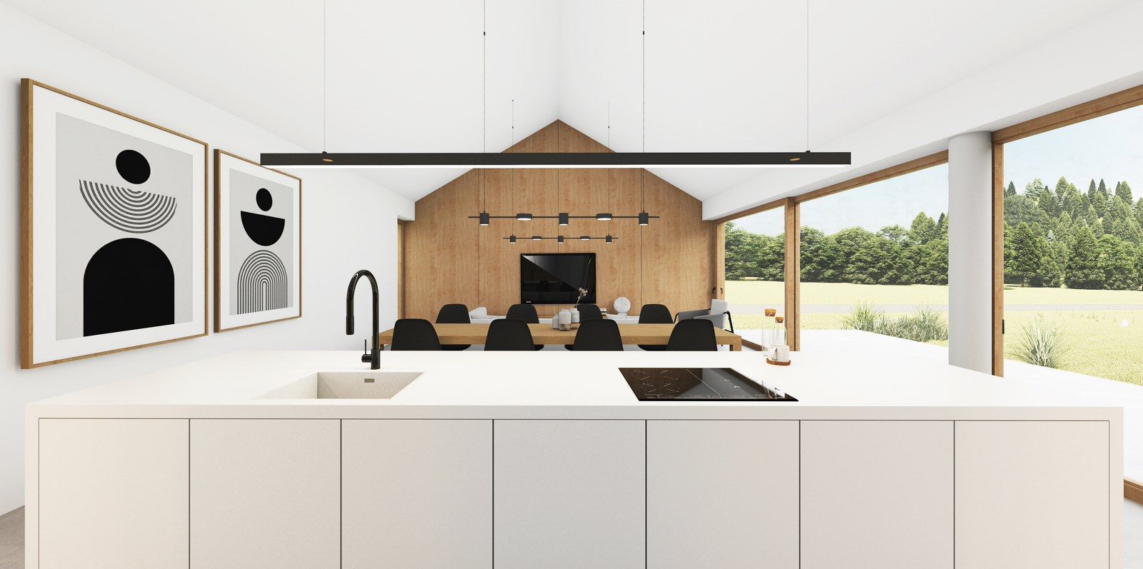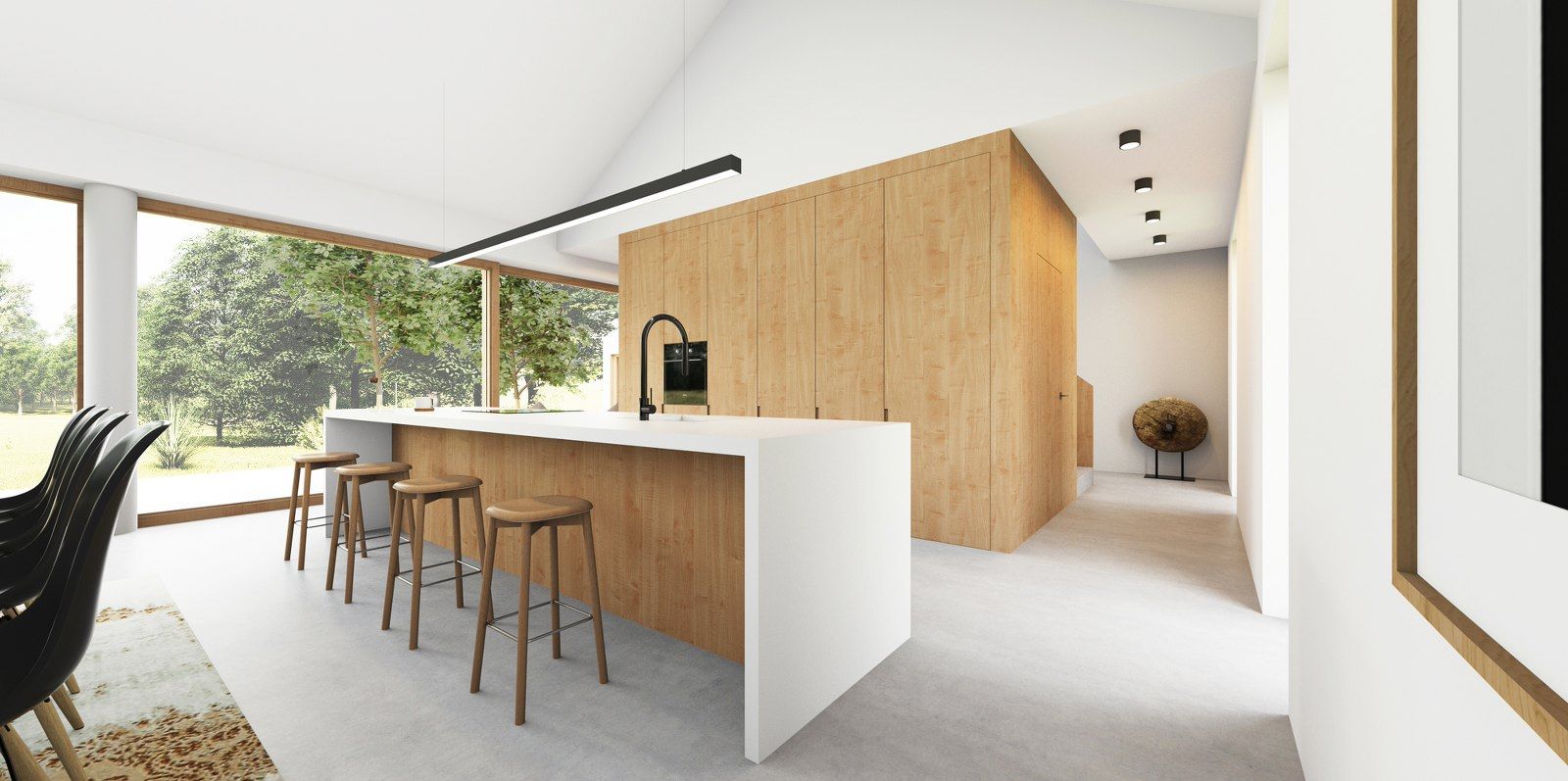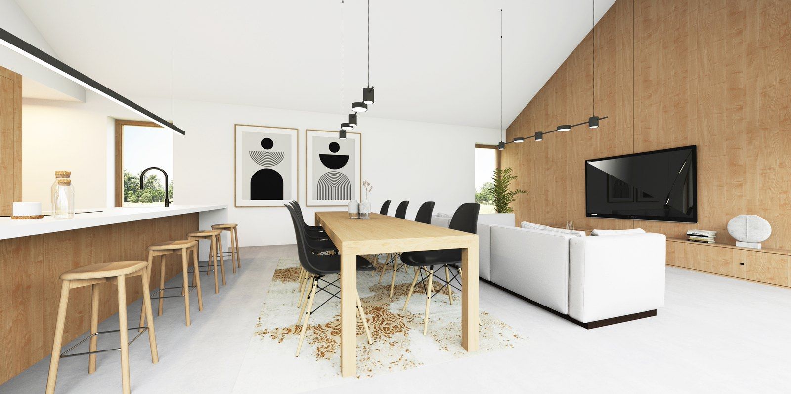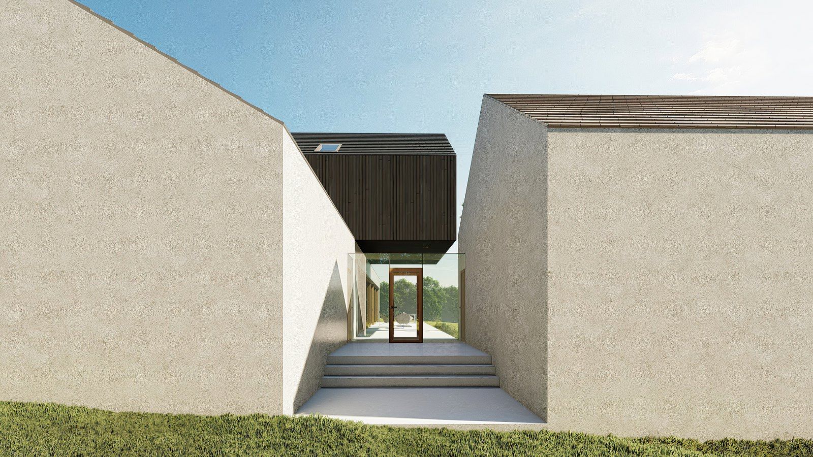 W projekcie postawiliśmy na współczesną, minimalistyczną formę architektoniczną, składającą się z trzech, wyraźnie zaakcentowanych brył. Dwóch na parterze, na kształcie litery L, w kolorach jasnej szarości oraz jednej “wiszącej stodoły” na piętrze, w brunatnej kolorystyce palonego drewna i ciemnej dachówki. Poprzez dodanie górnej, nadwieszonej części, horyzontalna bryła parteru zyskała dynamikę.
