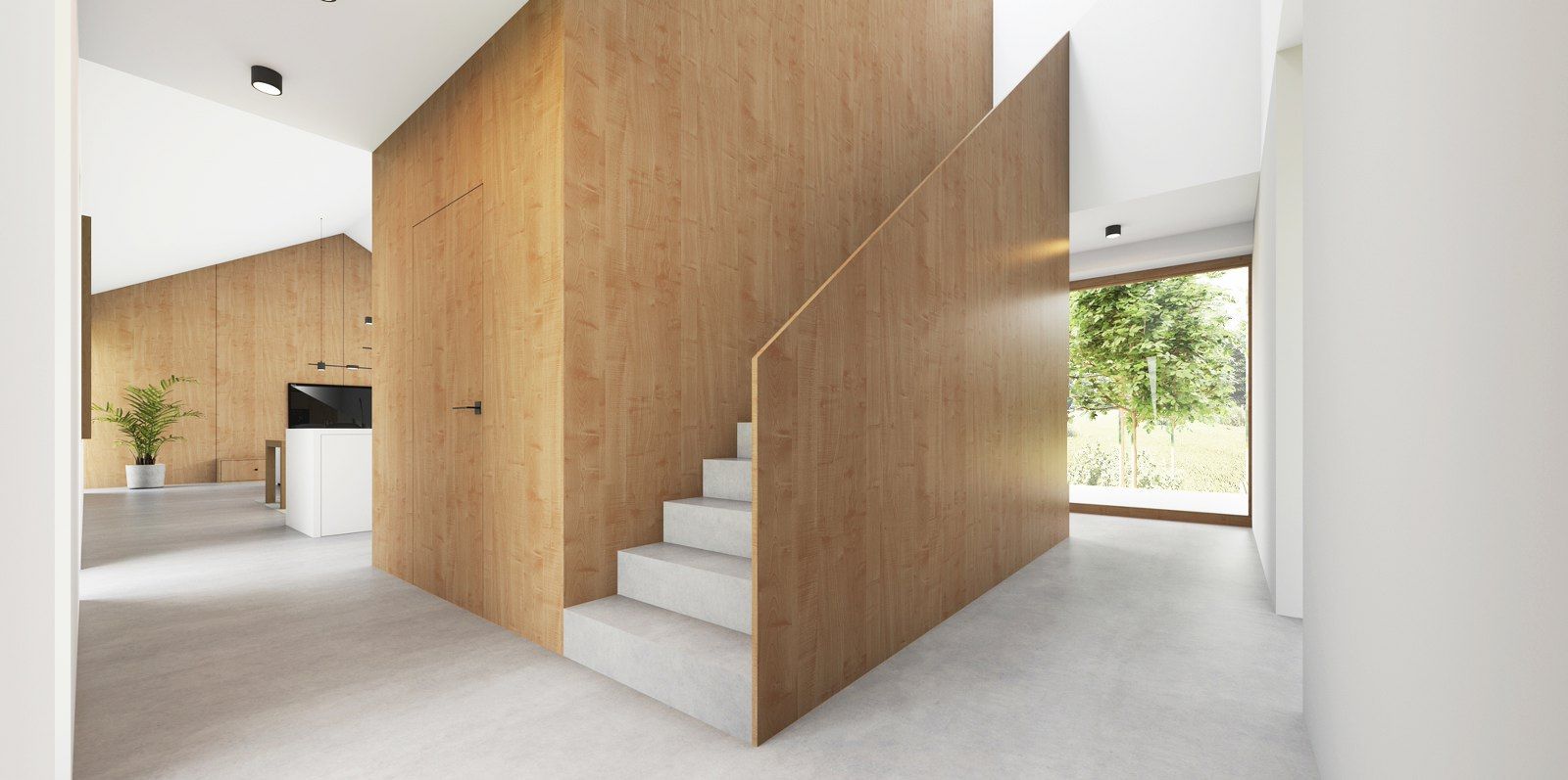 Działka jest dość duża, dlatego dom śmiało mógł być parterowy. Zdecydowaliśmy się jednak, że jedna jego część będzie wyniesiona na drugi poziom. Ten zabieg podyktowany był dwoma aspektami. Pierwszy: widoki. Z piętra można oglądać okolicę z innej perspektywy, pojawiają się widoki niedostępne z kondygnacji parteru. Drugi, typowo praktyczny, naturalne zadaszenie wejścia oraz części tarasu.