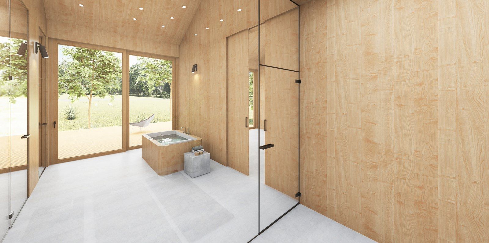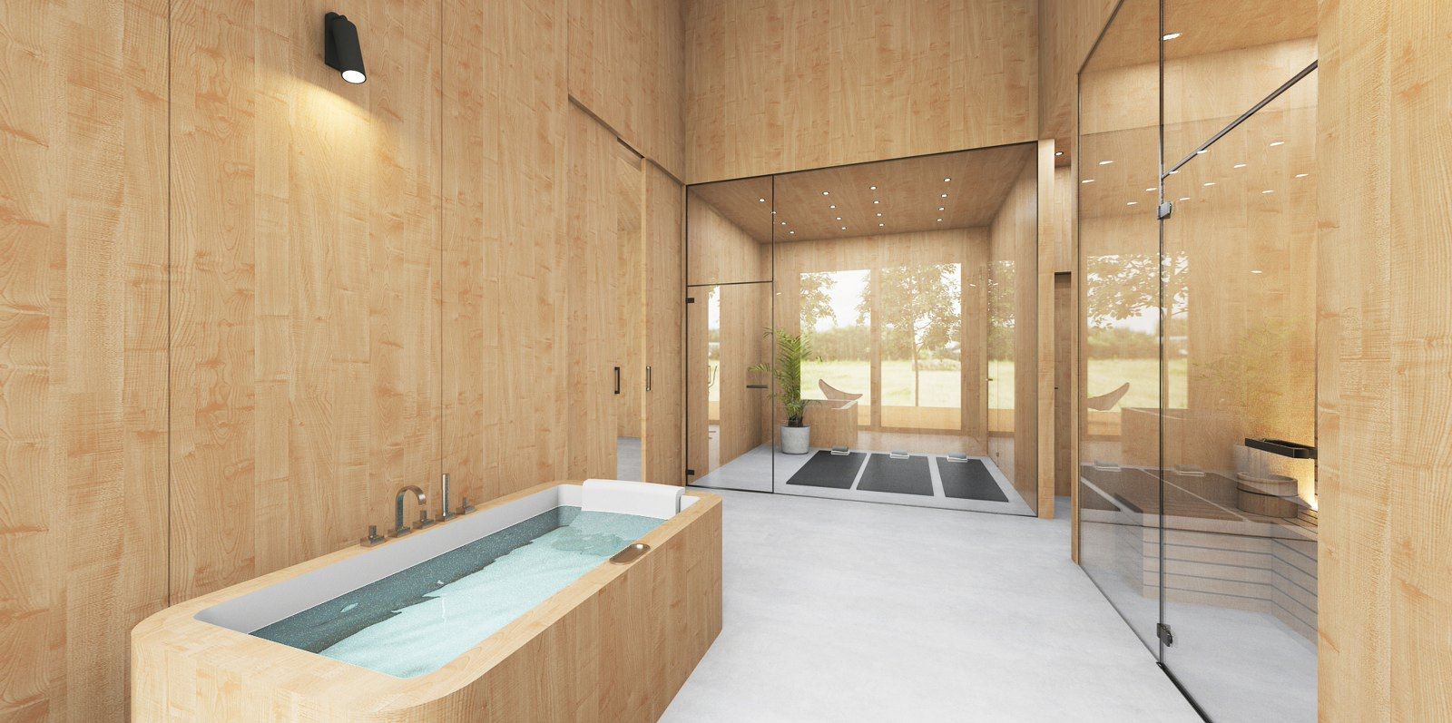 Strefę SPA zdecydowaliśmy się oddzielić od domu i zlokalizować w dolnej, północnej części działki, czyli od strony, z której mieliby przychodzić odwiedzający rodzice. Ze względu na spadek terenu, jest ona posadowiona nieco niżej niż część mieszkalna i połączona z domem lekkim, szklanym łącznikiem, w którym znajduje się niezależne wejście. I o to chodziło, żeby wejść do SPA nie trzeba przechodzić przez dom.