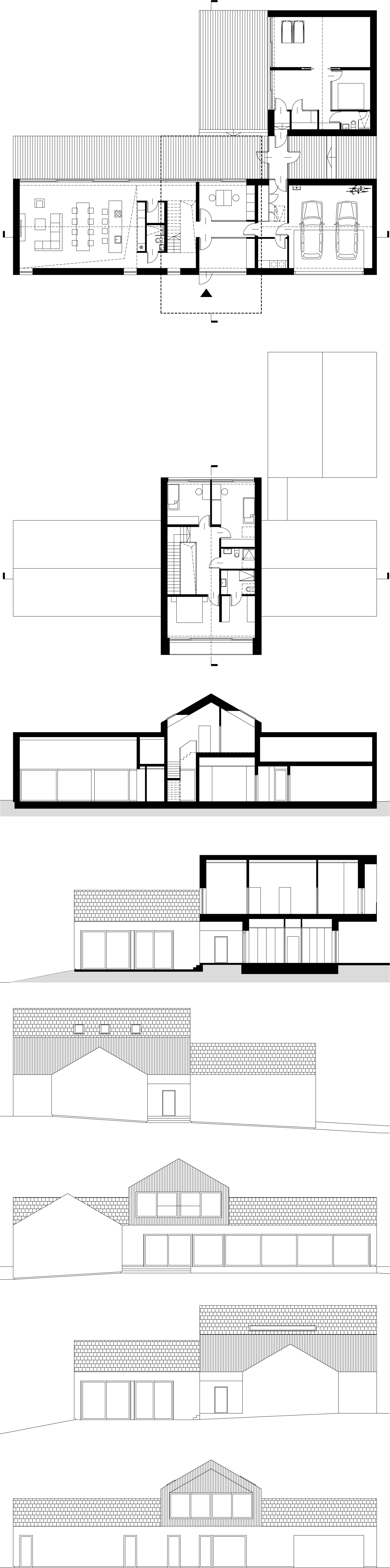 Ważne dla nas było również uzyskanie wrażenia wyraźnie przecinających się brył góry i dołu, czarnej i białej, dlatego linia okapu części dolnej jest w tym samym miejscu, w którym zaczyna się spód górnej bryły budynku.