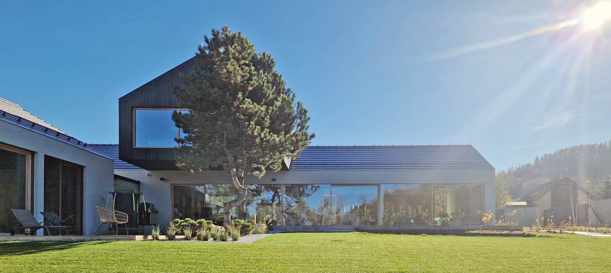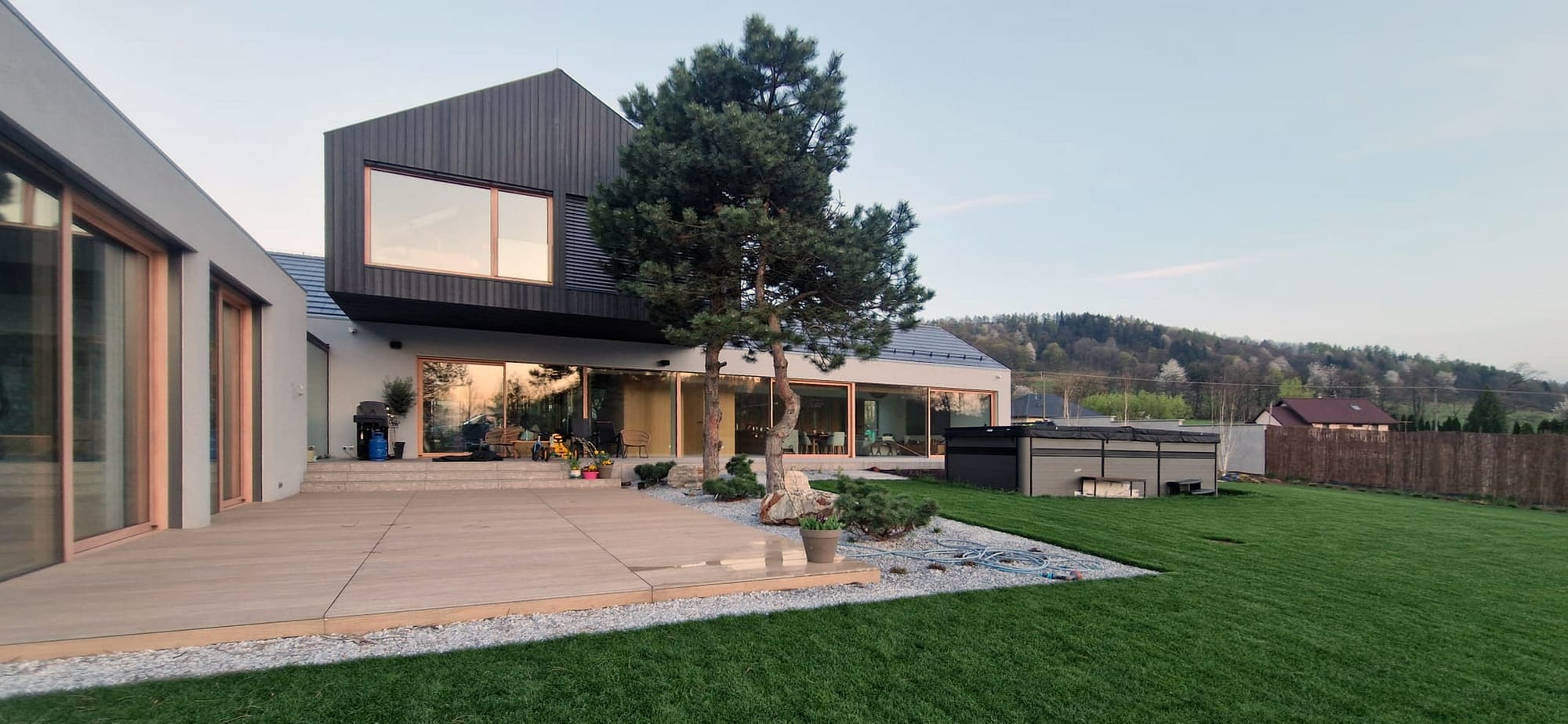 Część parterowa, w kształcie litery L, tworzy osłoniętą przestrzeń rekreacyjną ogrodu, w której znajdują się dwa tarasy na różnych poziomach. Od strony przestrzeni rekreacyjnej, czyli od zachodu, zaprojektowaliśmy dużą ilość przeszkleń otwierających jednocześnie widok na dolinę. Z drugiej strony domu, w nadwieszonej części, mimo, że znajduje się ona od strony północnej, przez ogromne przeszklenia otwiera się widok na góry. W projekcie zachowaliśmy również istniejące na działce drzewa, na czym zależało zarówno nam jak i Inwestorom.